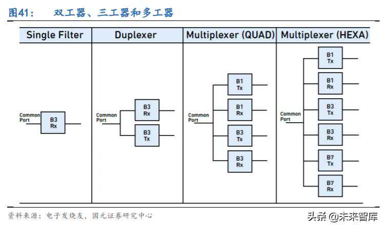 滤波器在射频前端应用时还能够整合为双工器、三工器、四工器,甚至是六工器,这类设备统称为多路复用器。多路复用器能够在满足性能要求的同时节省空间、简化设计,同时还能避免频段间的相互干扰。