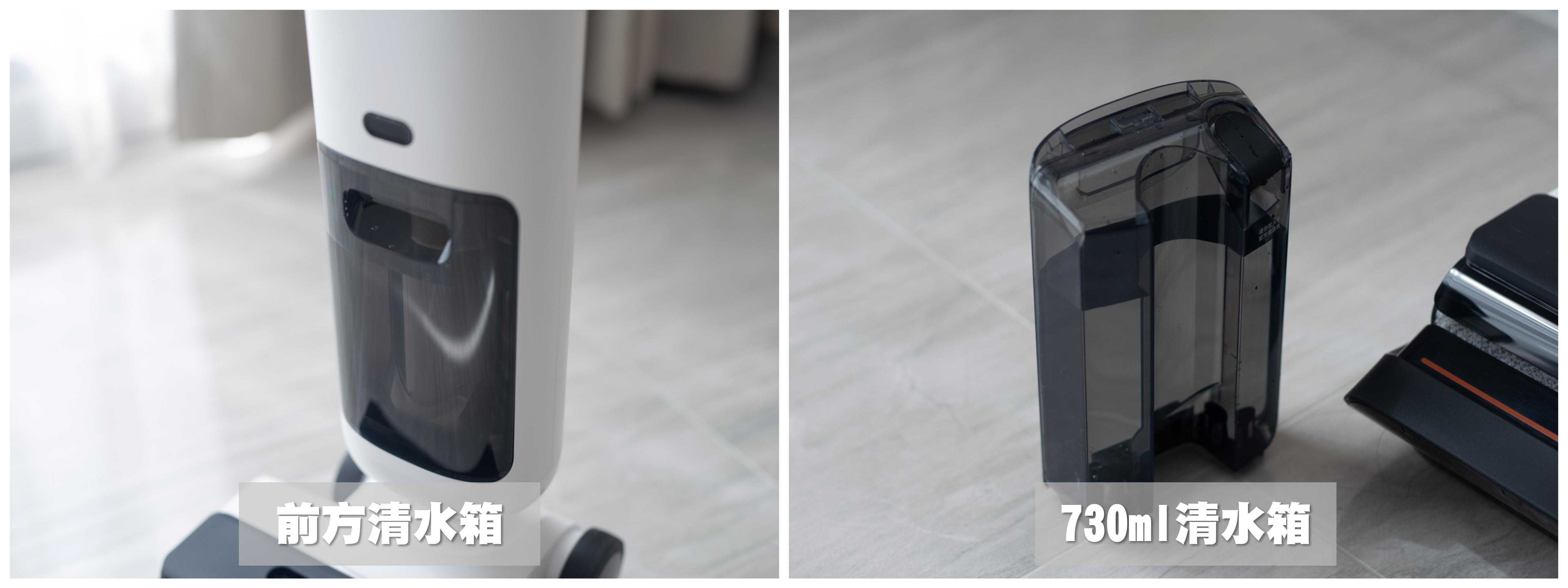 「水气分离」技术原理:⭐️前置水箱要做到平躺不漏水,而且还能保持高吸力,在清、污水箱的位置上,就采用了跟其他洗地机产品不一样的设计:清水箱在前、污水箱在后。在平躺后位于上方730ml容量清水箱,会因为重力的原因可以通过出水口正常为洗地机提供干净清水。