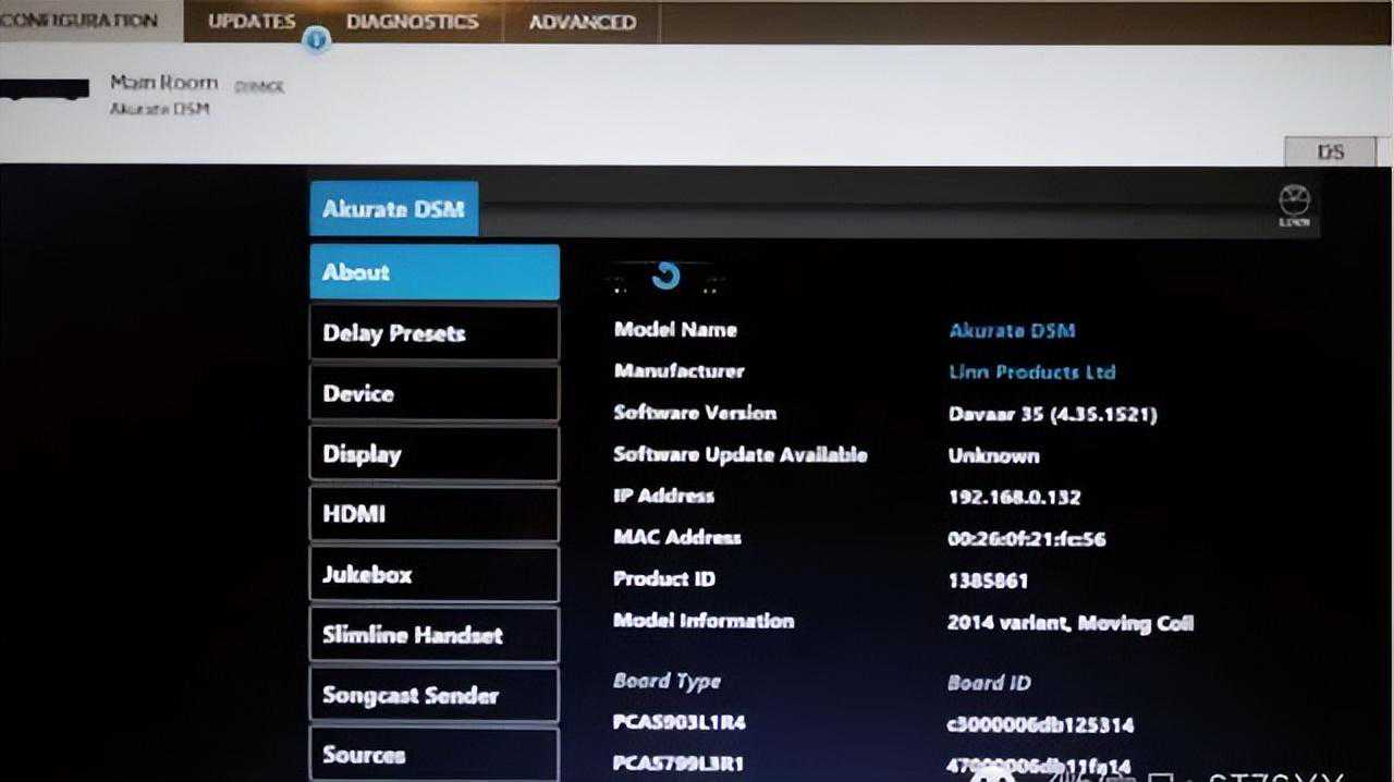 首先我们要下载一个Konfig软件,由于Linn的原厂网站包含唱片的付费内容,所以会被国内的杀毒软件屏蔽,目前全中文版的网站即将上线,以后就能在Linn的网站轻松下载了。首先把AkurateEXAKTDSM串流播放器或AkurateDSM数码前级连接路由器(路由器必须要能连上外网),再把同一局域网内的电脑或iPad上的Konfig软件打开,系统连接成功,我们进入主机界面。第一个看到的是包括产品ID、主板ID在内的多种信息,说明Linn像电脑一样精密。