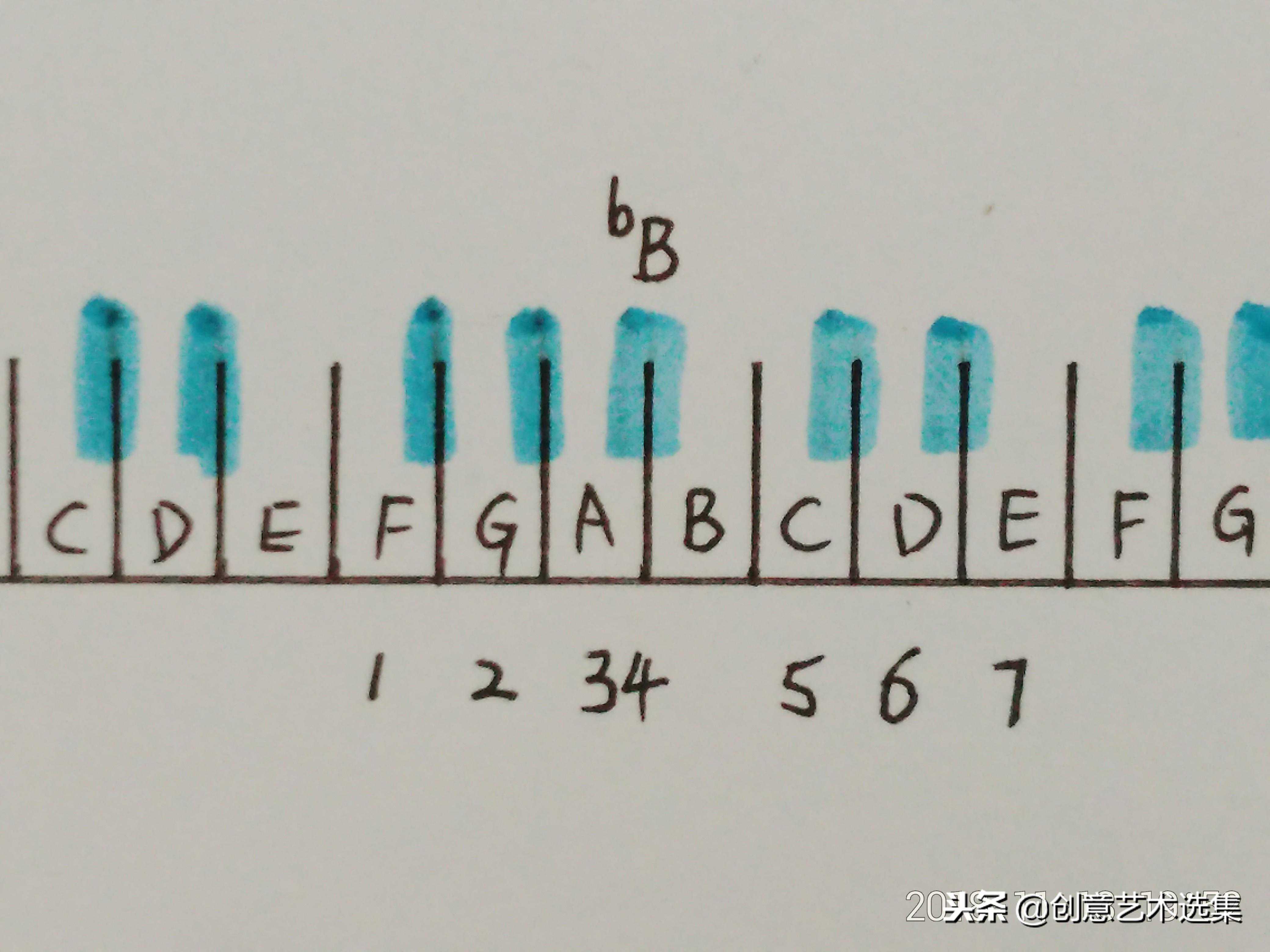 如图所示,F大调的音阶是:F、G、A、bB、C、D、E
