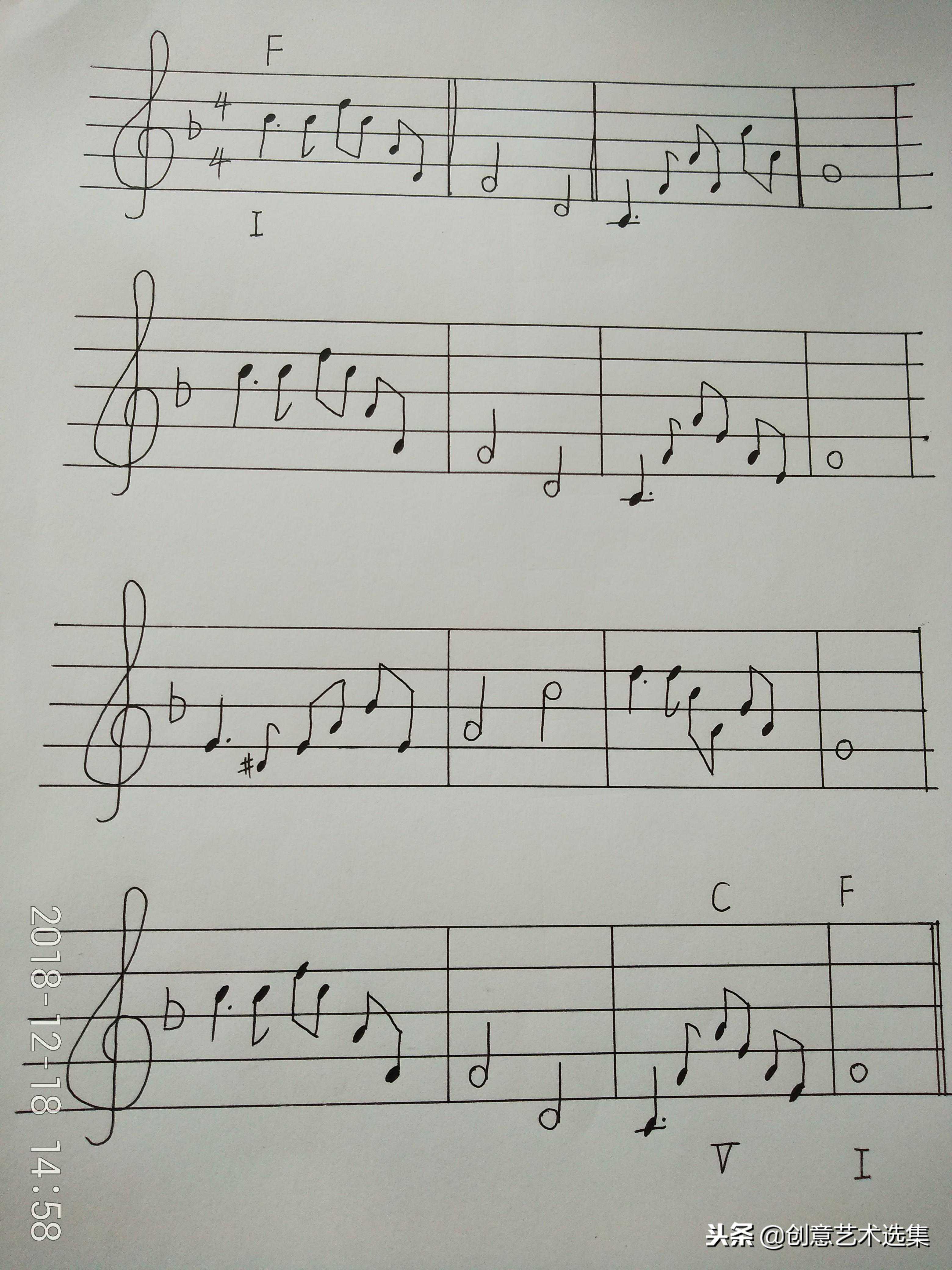 F大调配和弦这是一首F大调的歌,44拍。而且这是二段式的歌:aa’ba’,意思是第一行与第二行基本一样,第二行与第四行一模一样,第三行是别的旋律。