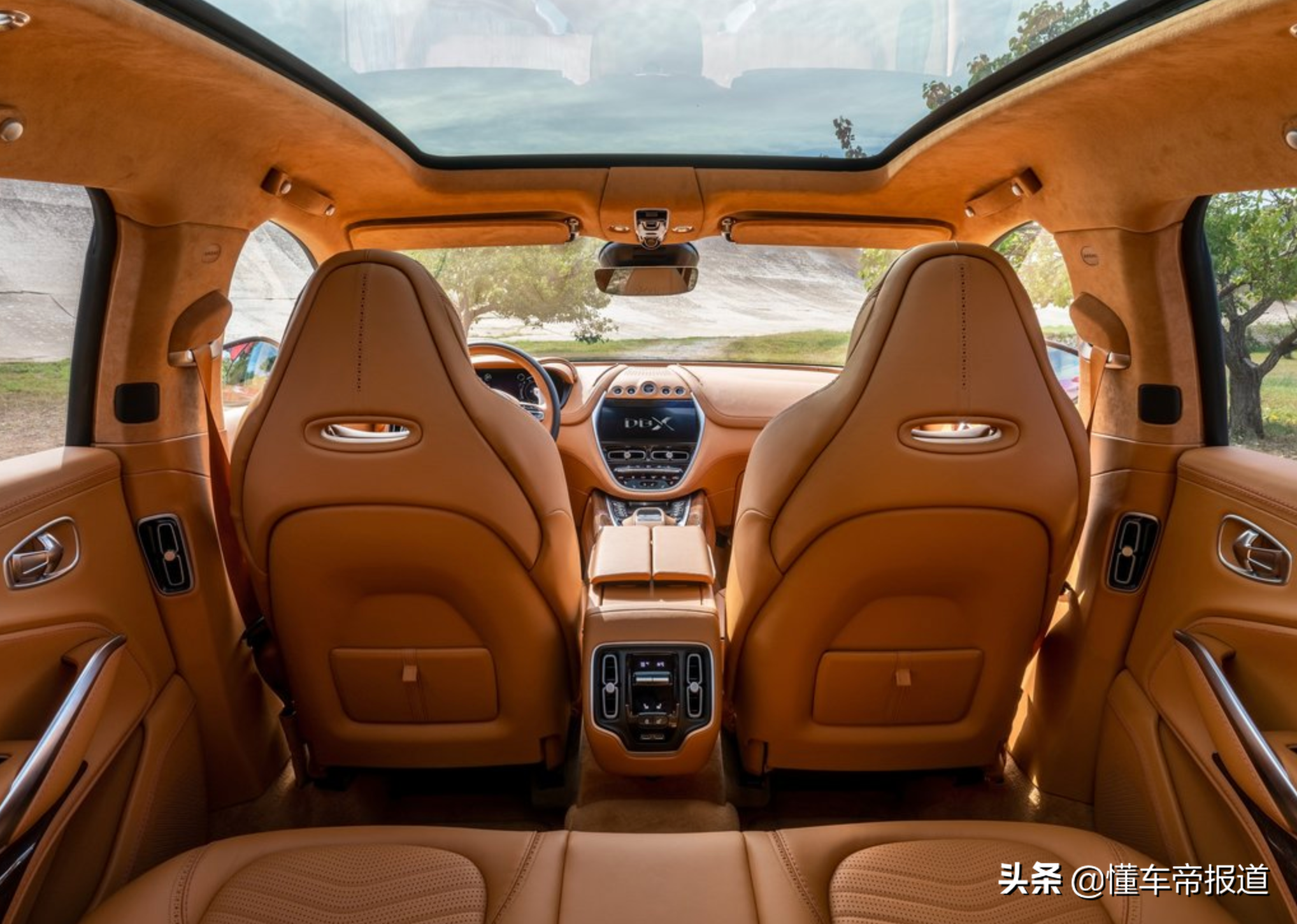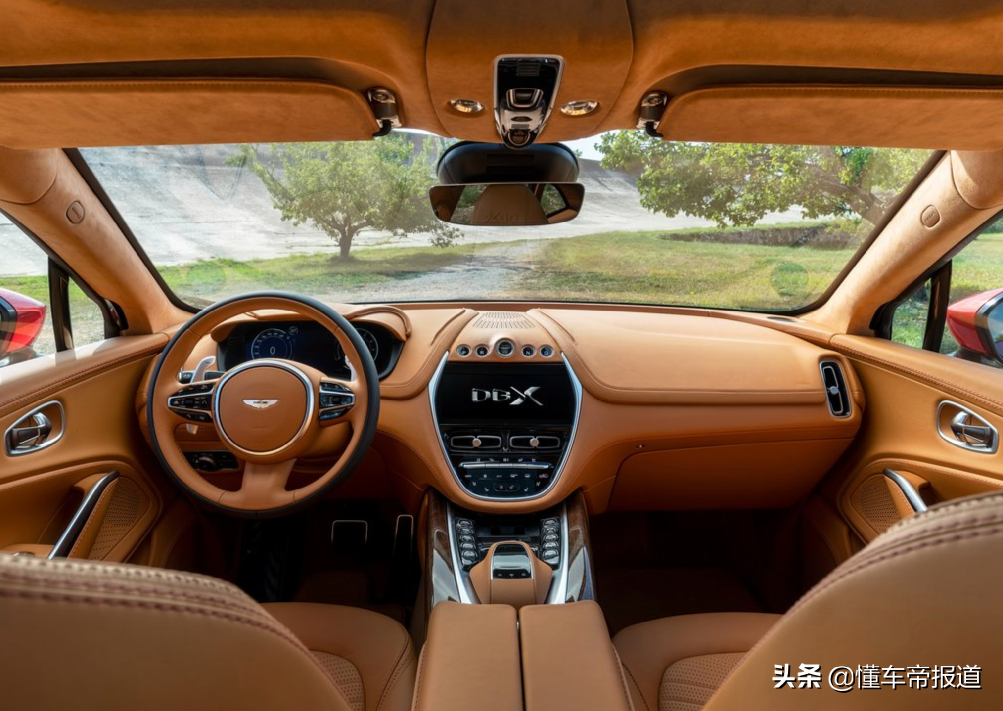 设计感和工艺感是DBX内饰氛围的重点,官方信息显示,无论哪种配置,每辆DBX的内饰打造都将花费200多个小时,由人工制作、缝制和组装。在科技配置方面虽然不是它的强项,但是也并不落后。该车仪表盘采用12.3英寸液晶屏,方向盘搭配有大尺寸金属换挡拨片,“拱桥”设计风格的中控台区域融合了阿斯顿·马丁与戴姆勒联合打造的10.25英寸中控屏,AppleCarPlay、360度全景摄像头系统以及64种颜色的氛围灯均为标准配置。