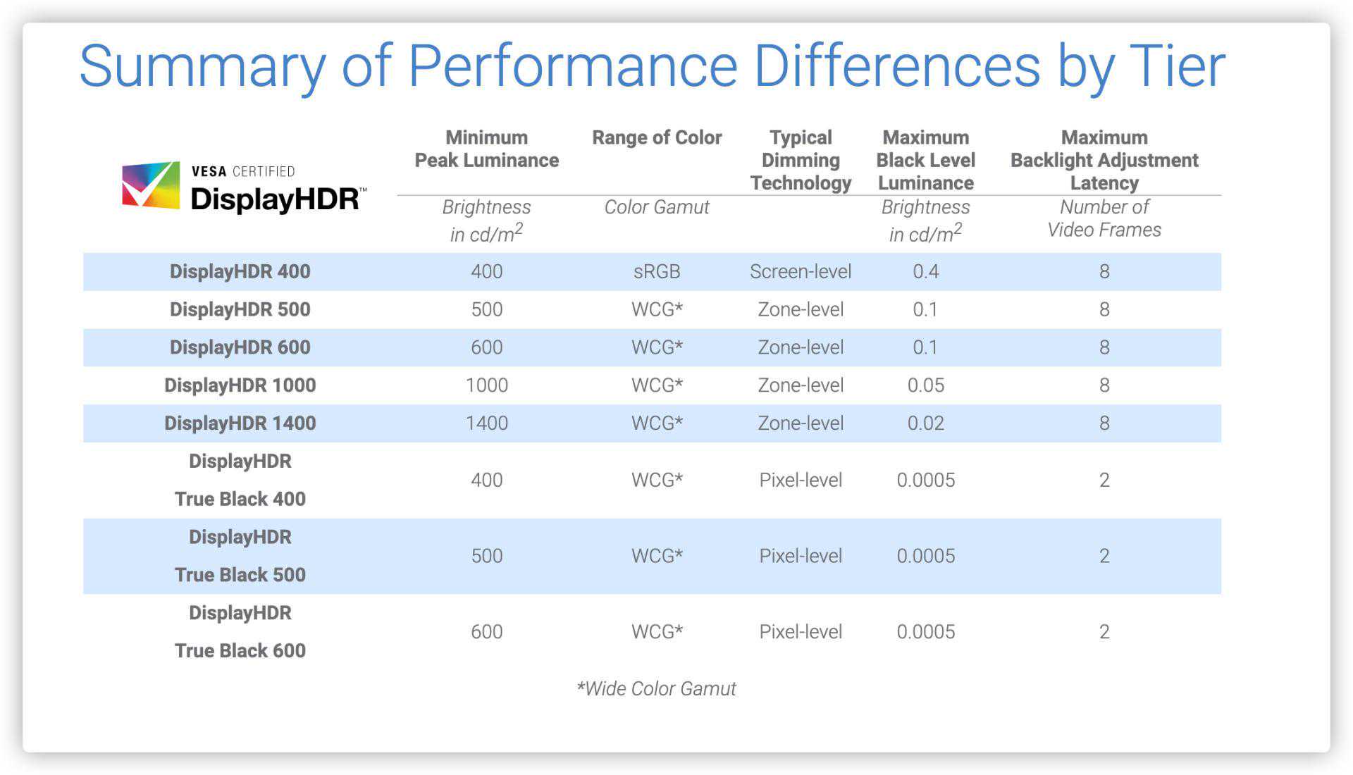 针对不同的认证,DisplayHDR标准涵盖了峰值亮度、色域、控光方式、最大黑态亮度、背光延迟等规格,严格的要求保证了DisplayHDR认证含金量。