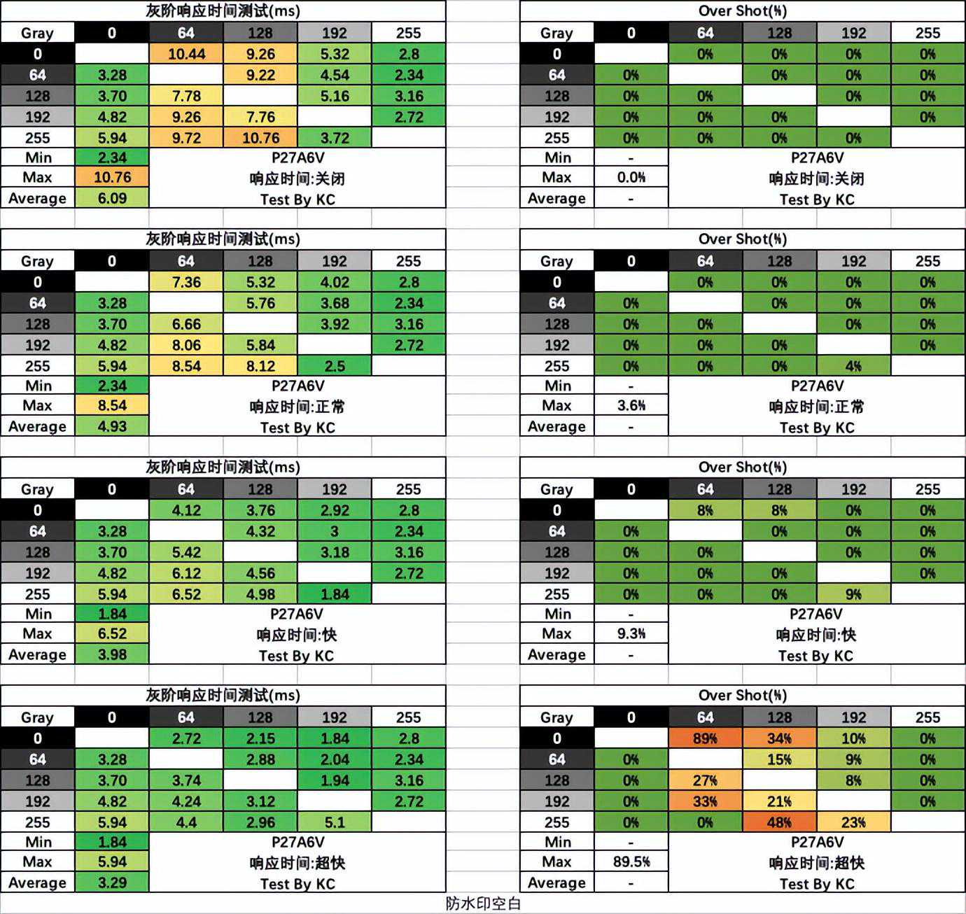 对于游戏显示器而言,最重要的可能就是响应时间以及HDR效果,所以这次的测试首先是响应时间。P27A6VOSD内响应时间分为关闭、正常、快、超快,分别对应OD关闭,以及三种不同档位的OD调节。注意这里测试的G2G响应时间,采用感光Sensor直接测试Rising/FallingTime,测试标准也比厂家标称更加严格。分别测量0/64/128/192/255灰阶间的响应时间,同时也记录每个灰阶变换时的OverShot,很多厂家标称1msG2G的显示器在本标准下测试实际G2G在2ms左右。