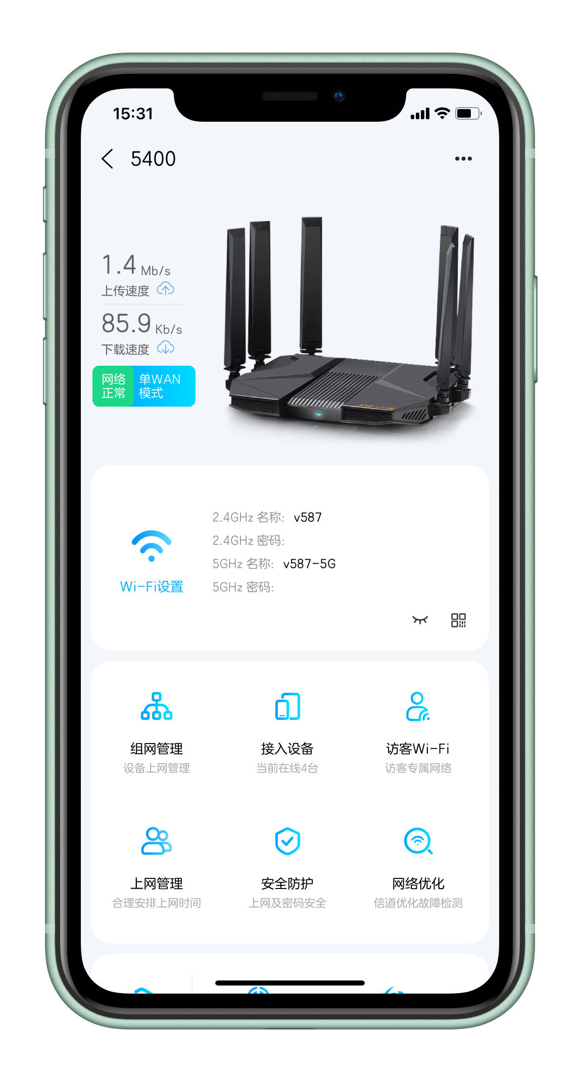 使用支持WIFI6的一加手机几乎就可以跑满运营商的千兆带宽,即使在家里最远的角落也衰减不多有700多兆,这也足够使用了,还将他们家的上下两层的智能家电接入到同一局域网。广西需要更换成路由器拨号的话需要运维人员上门服务,我不经常在她们家有这个速度暂时够用就不打算更改了。