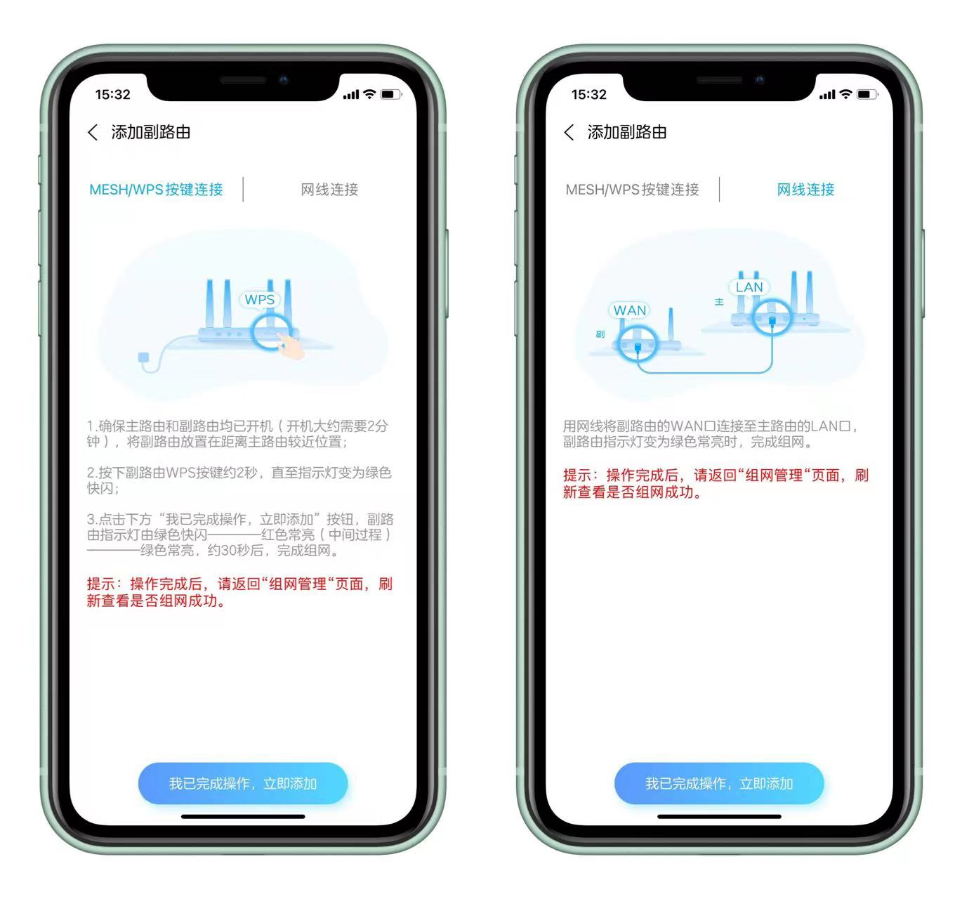 等副路由器的的灯为红色常亮后,再短按主路由上的MESH键,指示灯变为绿色闪烁后色后就完成了组网。