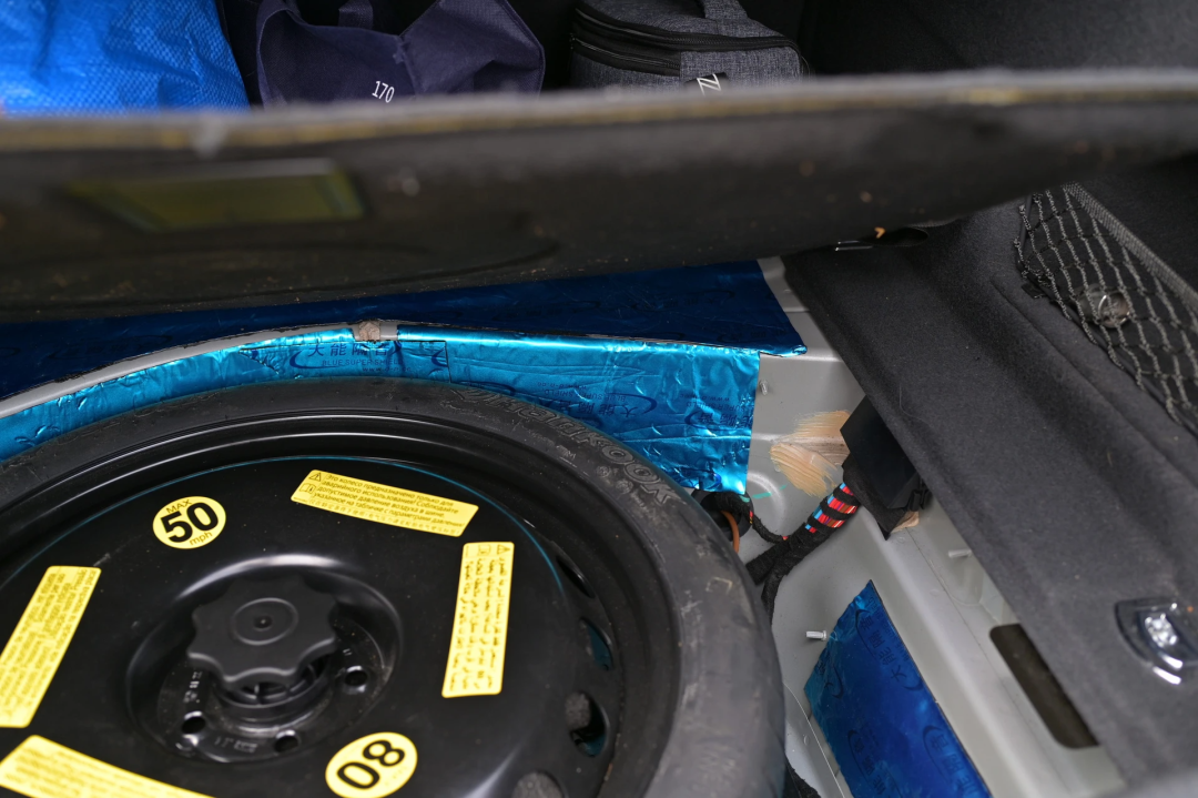 这个车的后备箱很大,我在翻看后备箱物品的时候,发现前车主还在备胎盆几个“据说容易共鸣”的地方粘贴了止振垫。