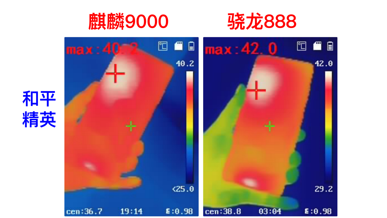 为什么骁龙888功耗会更高?或许发热能说明一些问题。麒麟9000玩和平精英30分钟最高温40.2℃,只是比王者荣耀高了0.5℃,说实话这个发热还是蛮出乎意料的。而骁龙888温度则同比升高了1.1℃,从温热变为了轻度烫手的42℃,尤其是边框会更加明显,骁龙开始“上火”了。