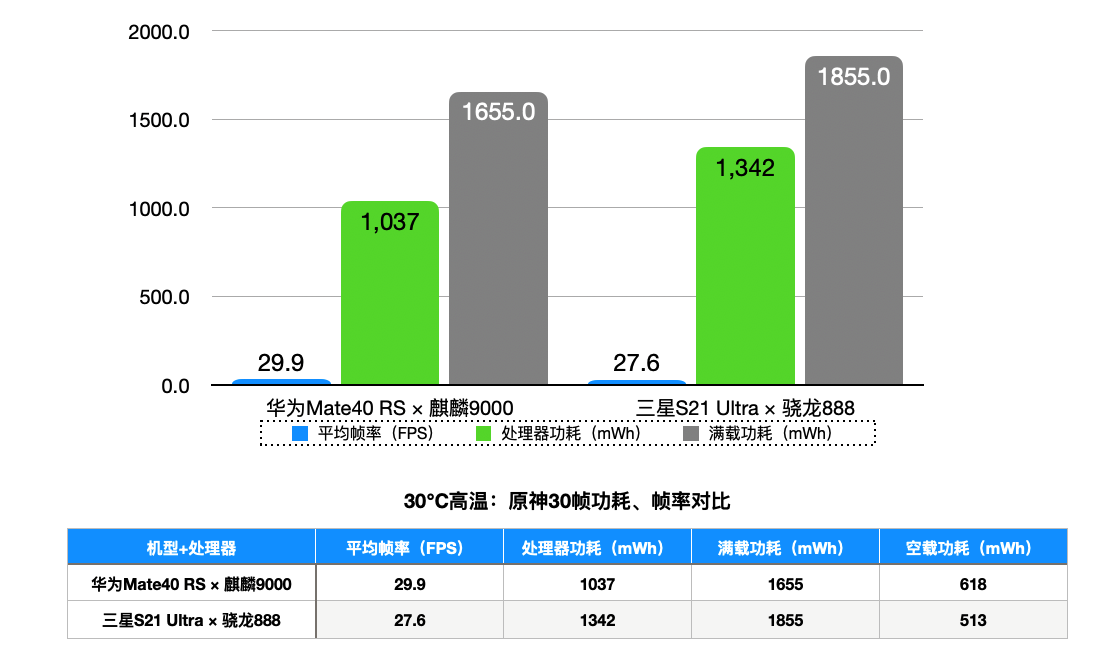 这一次先看功耗,麒麟9000功耗比骁龙888高了2035-1851=184mWh,也就是高了184÷1851=9.9%,这是骁龙888功耗首次战胜麒麟。对比第一部分内容中的原神30帧的功耗测试结果,麒麟9000同比增加了96.2%,骁龙888同比增加了37.9%,看来降低用户体验的锁帧对于骁龙888来说确实一个省电的好办法。