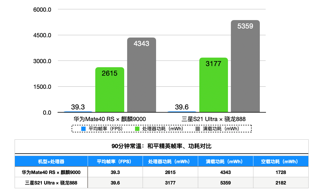 先看帧率,华为Mate40RS比三星S21Ultra低了39.6-39.2=0.4帧,原因并不是麒麟9000性能不足,而是因为有一局快速成盒子了,导致多一次,与上面测试王者遇到了一样的问题。简单来说玩吃鸡,麒麟9000与骁龙888也没什么压力。