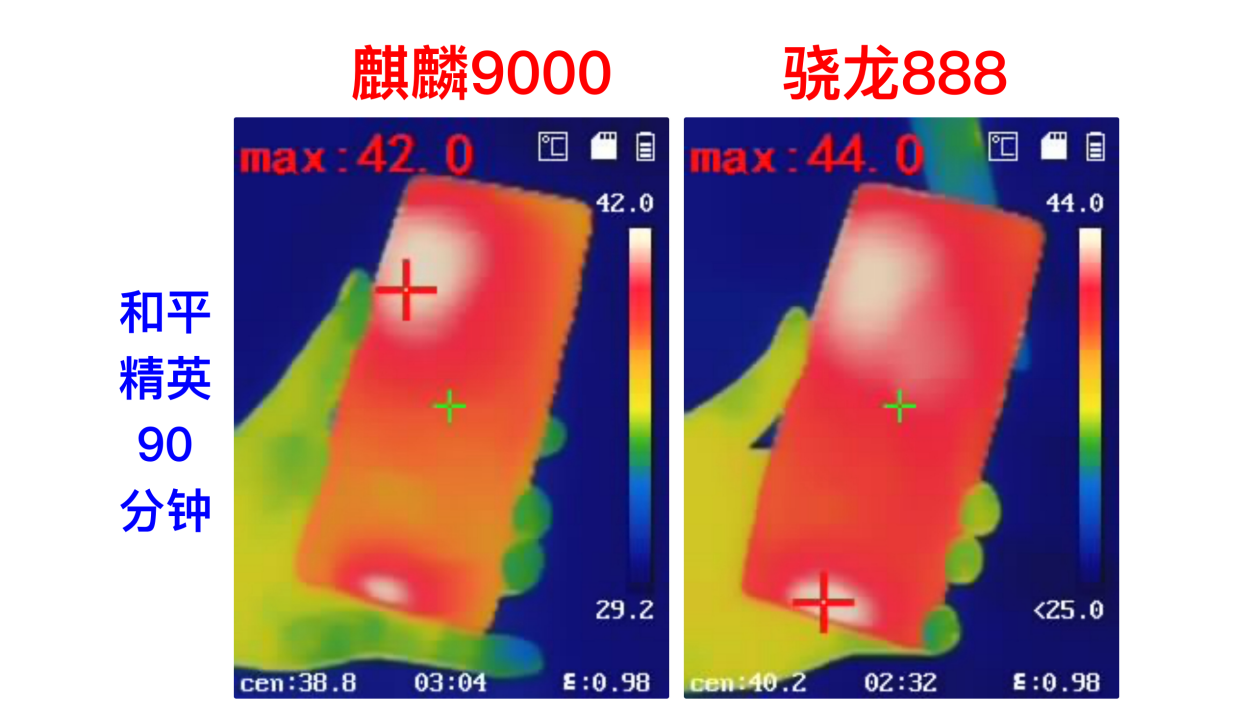 温度上,麒麟9000从上一次和平精英测得40.2℃上升到了42℃,升温1.8℃,麒麟也进入了烫手阶段。骁龙888则是从42℃直接上升到了44℃,升温2℃,从火热升级到“火烫”阶段。