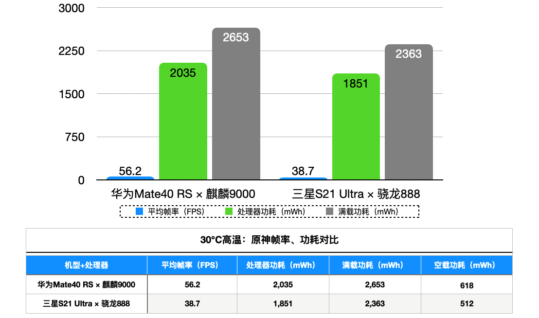 小结:通过王者、和平精英、原神三款游戏的一个高温环境测试,发现Mate40RS确实比三星S21Ultra体验优势明显,在高温天麒麟9000的性能输出更加持久、稳定,CPU+GPU高能效比进一步凸显,游戏发热更低、功耗更低。骁龙888则像是一个反面,虽性能强劲,但能效比低与可能的调度问题,遇到中高性能需求时会快速升温,导致要么是功耗大幅增加,要么是为了降发热而卡顿掉帧。