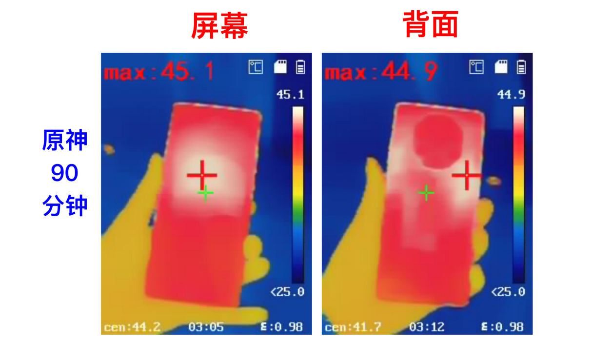 最后再来看看性能跑满的情况下,发热会如何,由于两款手机的极限温度都出乎意料,因此这次正反面的发热都记录了。