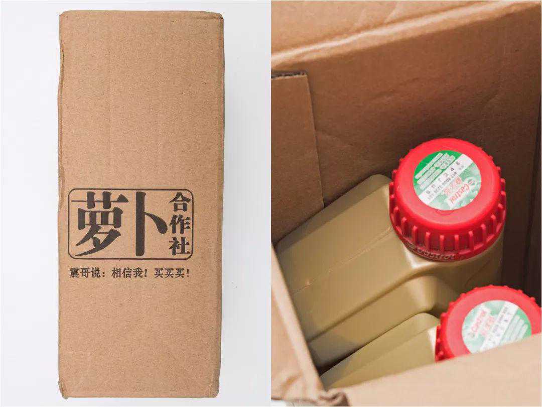 收获后我们发现又是一个伪装满分的包装——打开“气动装潢直钉盒”,两瓶机油立即露了出来。和萝卜合作社一样,这个机油的包装箱内依然缺少减震填充物,开箱给人的感觉较为简陋。拿出机油,机油瓶身完成干净,机油盖缠有胶带用于加强密封效果,打开瓶盖,机油瓶口还是无覆膜。