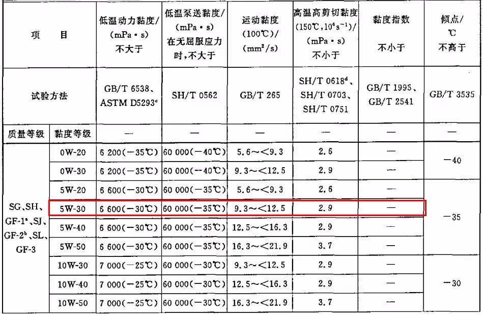 ▲在国标GB11121-2006汽油机油标准中,规定了5W-30各项达标参数。不过主要针对的是SG、SH类机油,再次证明机油国标低于国外标准。