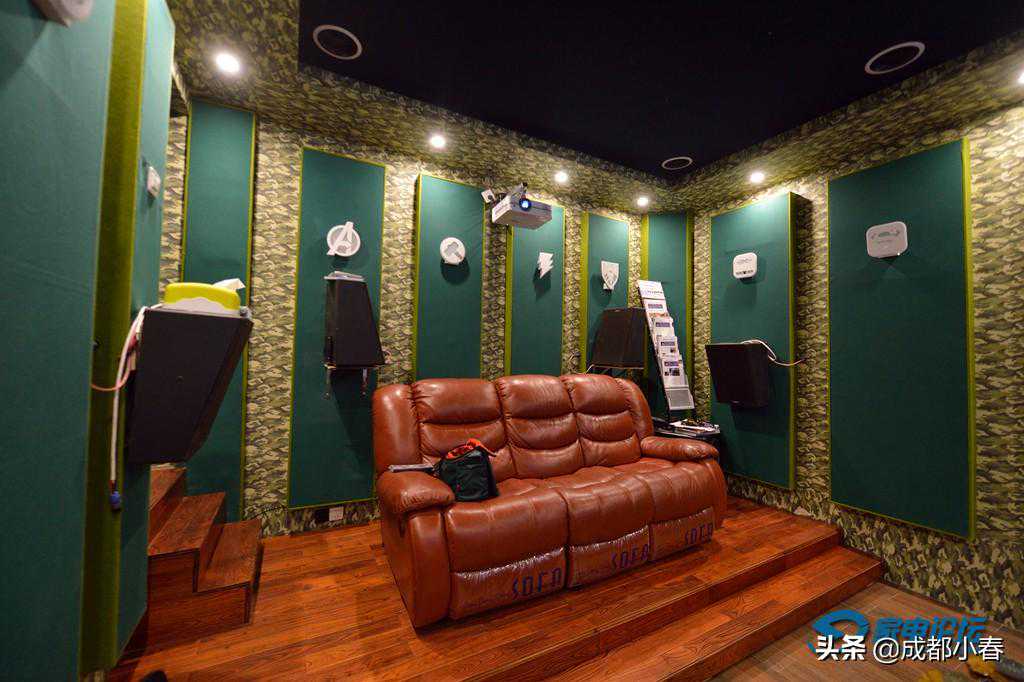 发烧友可以看下两张图,面积不大,也并没有使用过多的声学扩散和吸引。这个影音室,注重的理论是实际经验相结合。比如,很多发烧友都喜欢将低音炮直接对着观众。但是在这个房间,小春有意将低音炮的朝向对准的侧墙。