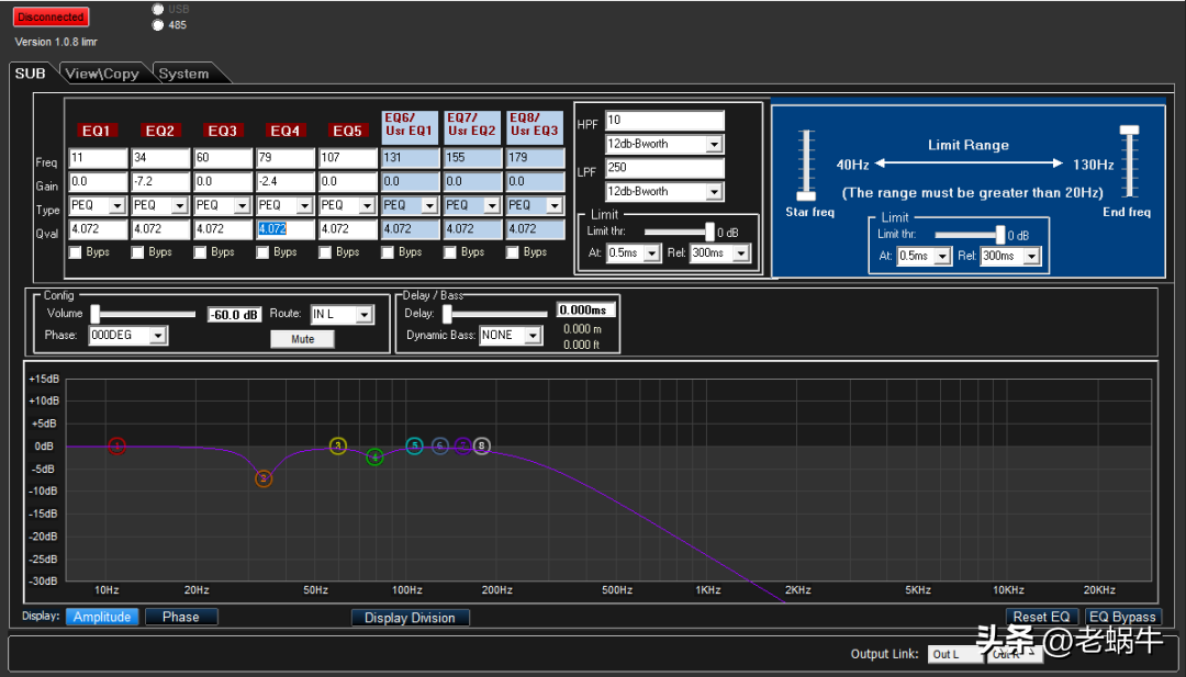 也许你也注意到了,它有个不怎么显眼的SERVICE字样USB接口(被黑色盖子挡住了),就是留给工程师进行专业调音用的,C110内置了一个数字DSP处理系统,自带8组PEQ,还可以做延时、相位等校正。