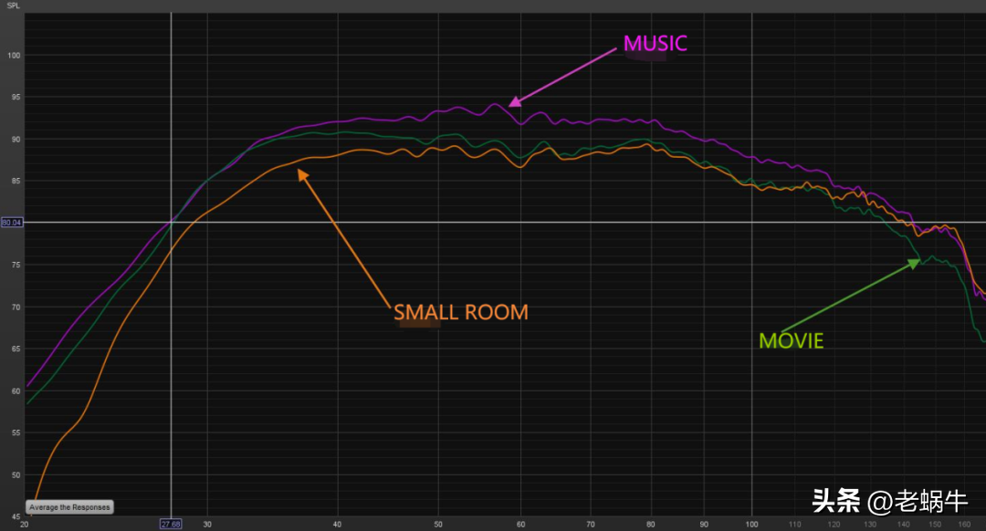 MOVIE适合大部分家庭影院场景使用,整体上是比较均衡的,低频延伸下限可以到28Hz作用,与标称的25Hz(+-3dB)基本符合;SMALLROOM的思路就是在影院模式基础上做一个低切,避免房间增益导致超低频消散缓慢,如果你的使用环境很小,低频延绵不绝,可以尝试切换到这个模式试试;MUSIC模式的频响类似多得森倒U形曲线,60Hz低Q值高增益突起。