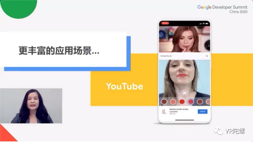 在YouTube中的应用。用户可以一边看美妆博主示范化妆方式,一边可以使用AR功能进行实时试妆。