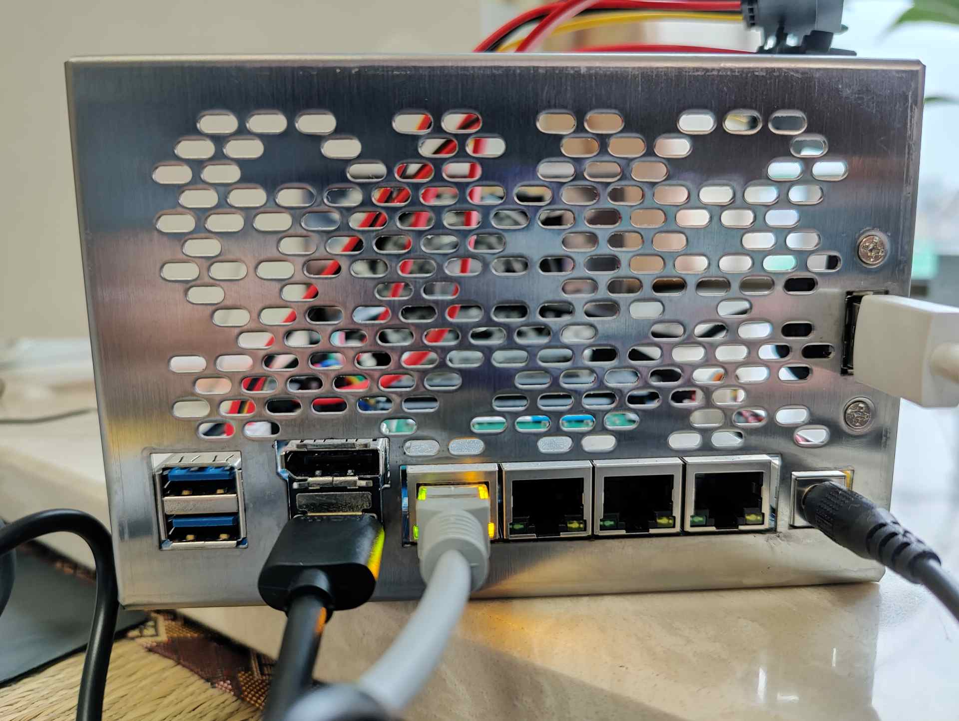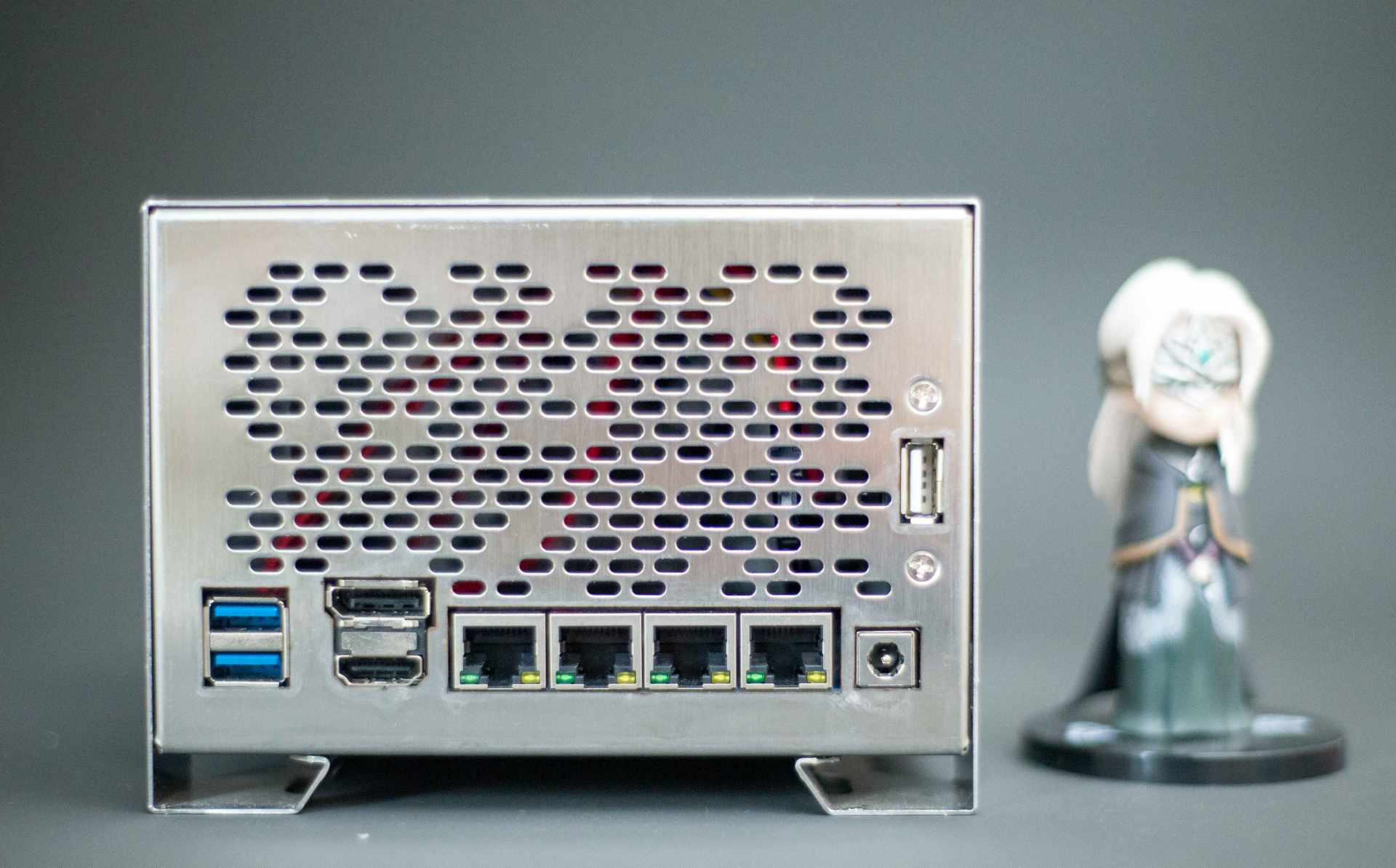 ▼正面上部同样是椭圆状的进风口,下方则是各种接口了。4网口充当软路由足够,此外还提供了HDMIX1、DPX1、、以及AC电源接口。
