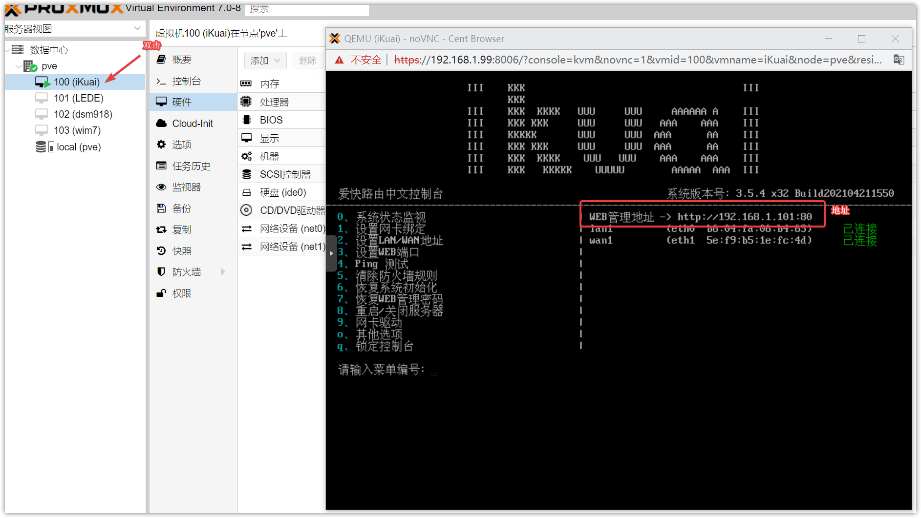 ▼双击左侧的iKuai虚拟机会弹出控制台,这里可以进行各种设定,站内有大量的教学文我就不再赘述。其实这里不用过于折腾,关键是这里我们可以看到LAN/WAN口已经正常启用,WEB管理页面在这里也能看到。