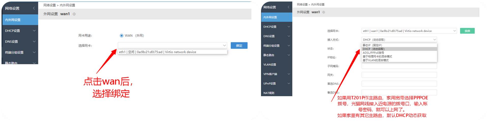 ▼跟随步骤绑定WAN口,配置接入方式那里,如果你和我一样打算将T202P设为主路由的话记得选择PPPoE拨号,下方填入宽带的账号密码。如果作为其他方式那就选择自动获取。