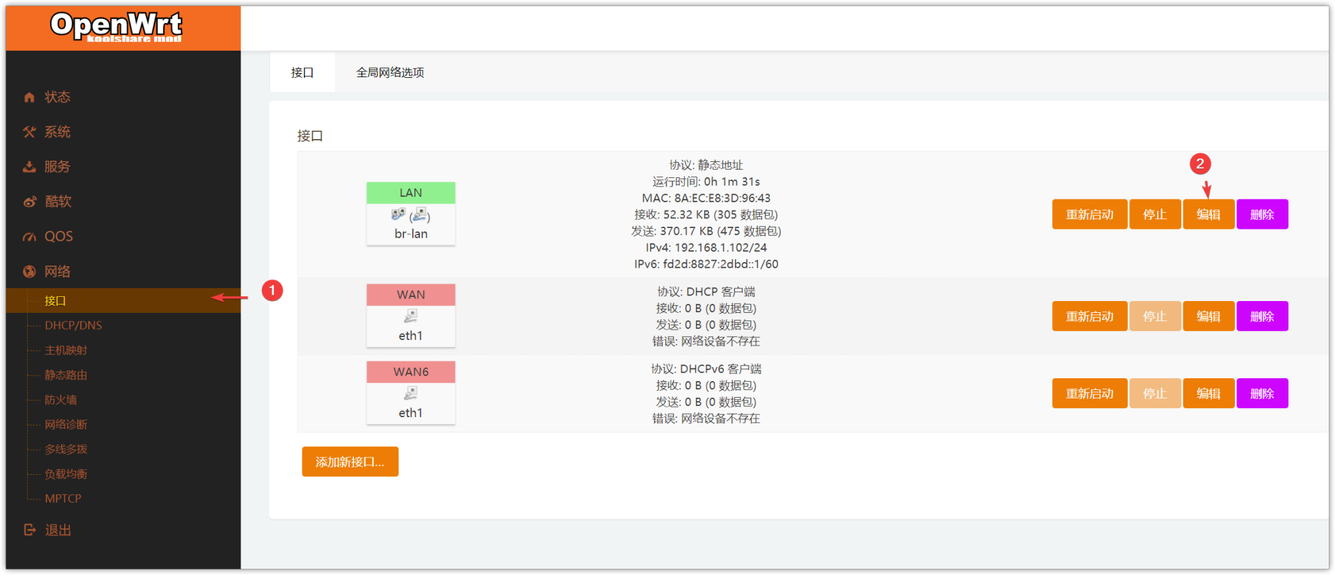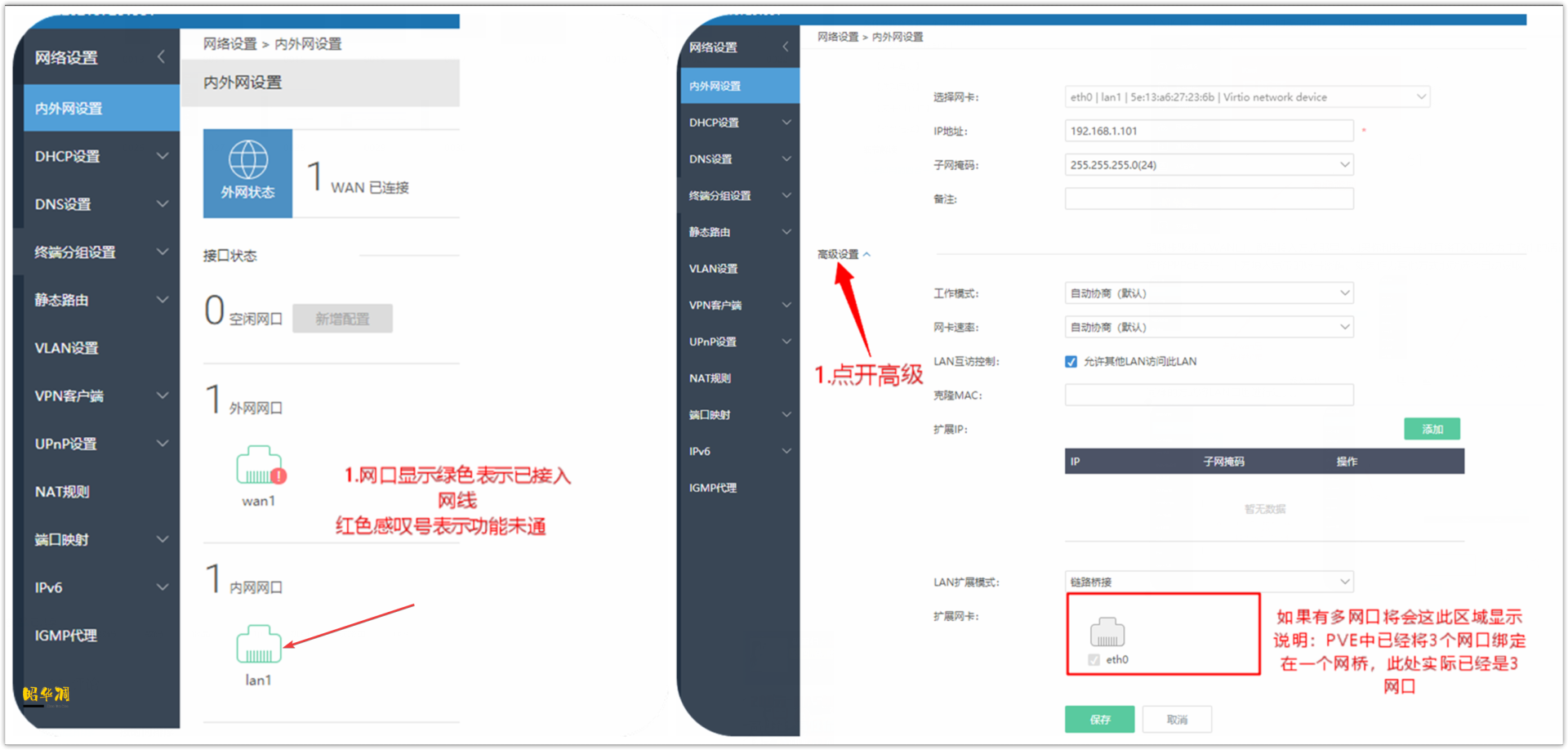 ▼同样的方式将LAN口也进行定义。铠晶大佬已经把三个网口绑定在一个网桥上,所以这里虽然显示的只有一个LAN口,实际上已经把其余三口都设定好了,整个过程真的超级傻瓜。