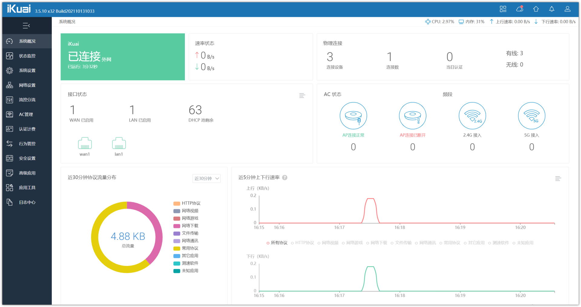 ▼重启以后进入iKuai,可以看到此时已经可以正常上网了,是不是超简单。至此iKuai就设置完成,可以将之作为主路由正常使用了。