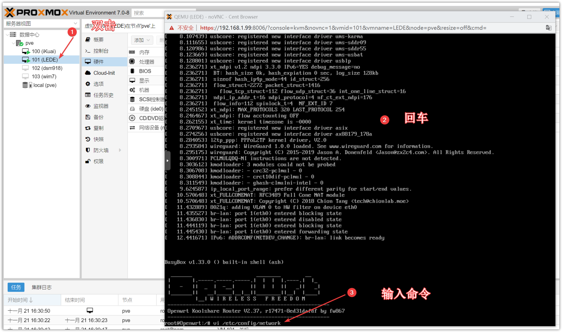 ▼进入LEDE可以看到当前分配CPU为1核,内存也只分配了512M,这个可以自行到PVE后台调整,调整结束后在虚拟机里面重启一下就行。