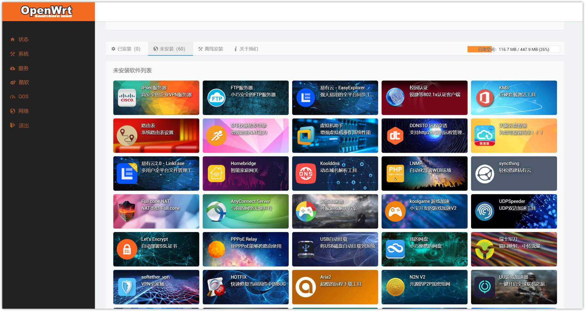 ▼LEDE就是玩插件,下面的软件仓库里直接安装就行(需要自行下载离线包,懂的都懂)。