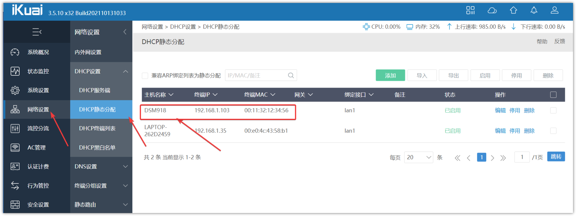 ▼最好把IP地址固定好,方便后续管理。在爱快的【网络设置】-【DHCP静态分配】给群晖一个好记的地址,比如我是设的192.168.1.103