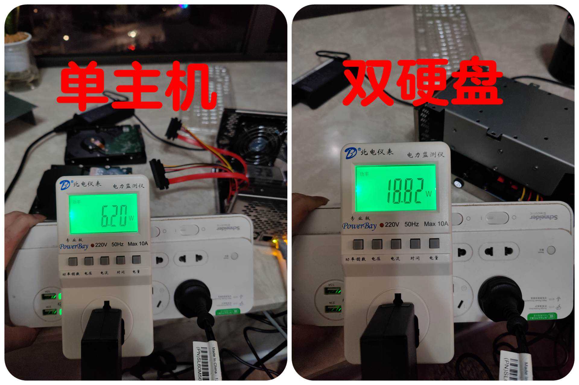 ▼单主机实测功耗不到7W,双硬盘实测功耗19W左右,就算按照20W来算,24小时也不到1度电,比我的黑裙8400省电太多。