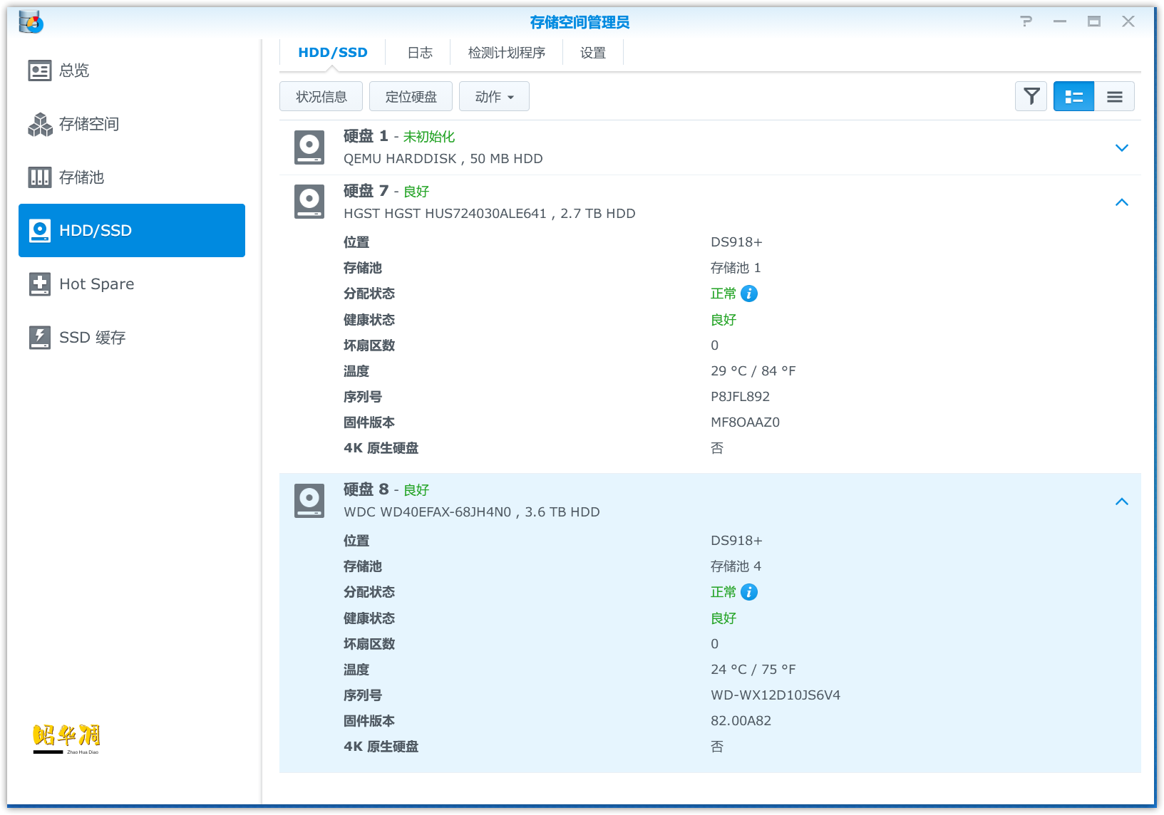 ▼进入群晖可以看到硬盘温度,两个硬盘分别为29°/24°,虽然有很大部分是天气冷的原因,但放在柜子里有这么好的温度表现我是比较满意的。