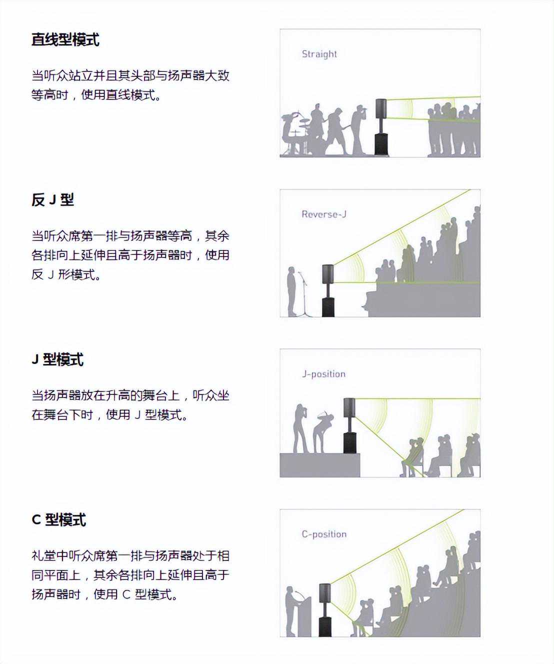 可调节指向性阵列,轻松调整覆盖模式——“直线型”、“C型”、“J型”或“反J型”,优化不同空间的声音:地板、舞台、倾斜座椅或露天看台等等.