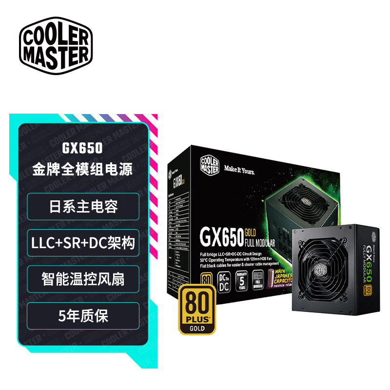 电源根据CPU和显卡组合挑选对应功率就好,这里示例选择的是日系主电容、金牌全模组的酷冷至尊GX650W这款电源,方案靠谱,性价比高适合学生党,五年质保足够保障大学四年时间安稳使用。