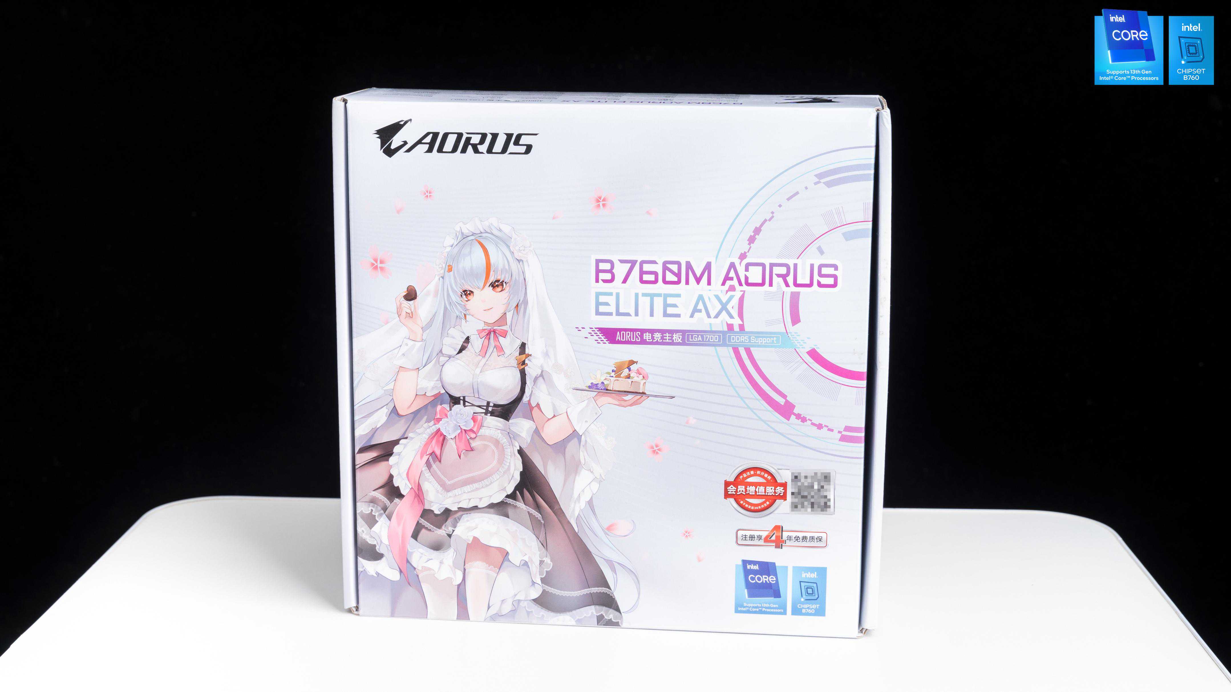 技嘉B760MAORUSELITEAX小雕WIFI(雕妹限定包装)实际上就是B760M小雕WIFI的后期版本(),主板包装方面也进行了全新换装,从原来的金属电竞大雕头风格变成了二次元雕妹,更能吸引死宅的眼球,下方二维码标注了支持四年全国联保,这方面是技嘉优势显著之处,毕竟比常规多一年质保就是多一份安心。