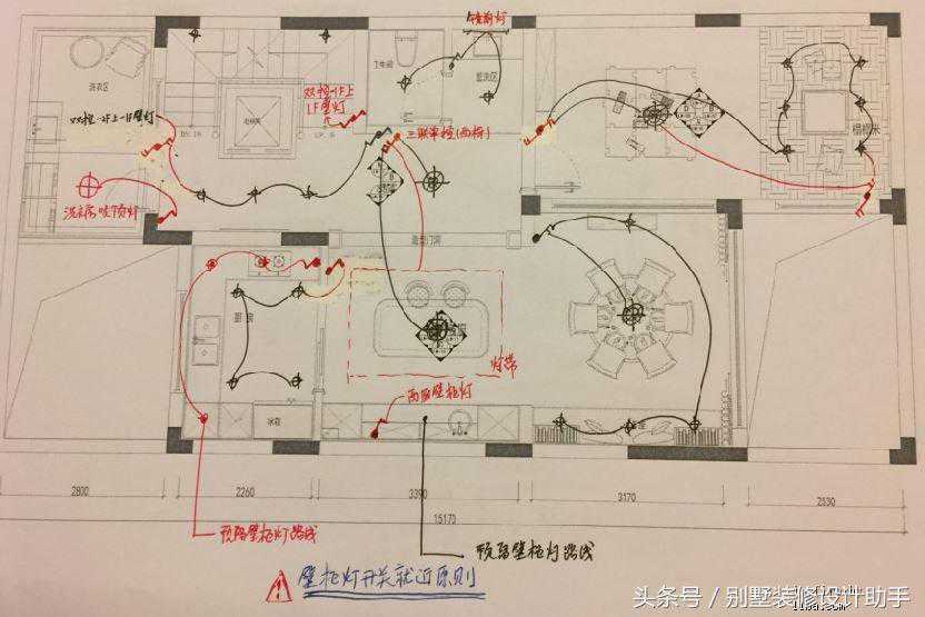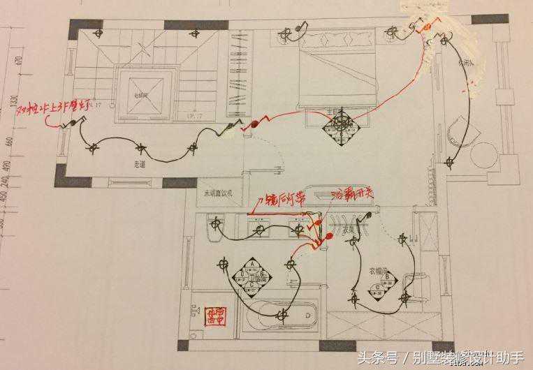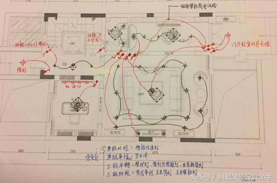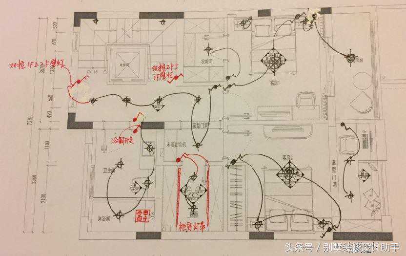 今晚闲来无事,把设计师的开关布置图过了一遍,基本满足要求,但是我又增加了一些自己的生活习惯并修改了一些不足,合理性得到提升。手绘版本有点粗糙,实在是懒得开CAD搞了~红笔为我的修订,黑笔为设计师原设计方案,为了容易查看,我全部给手绘出来了。