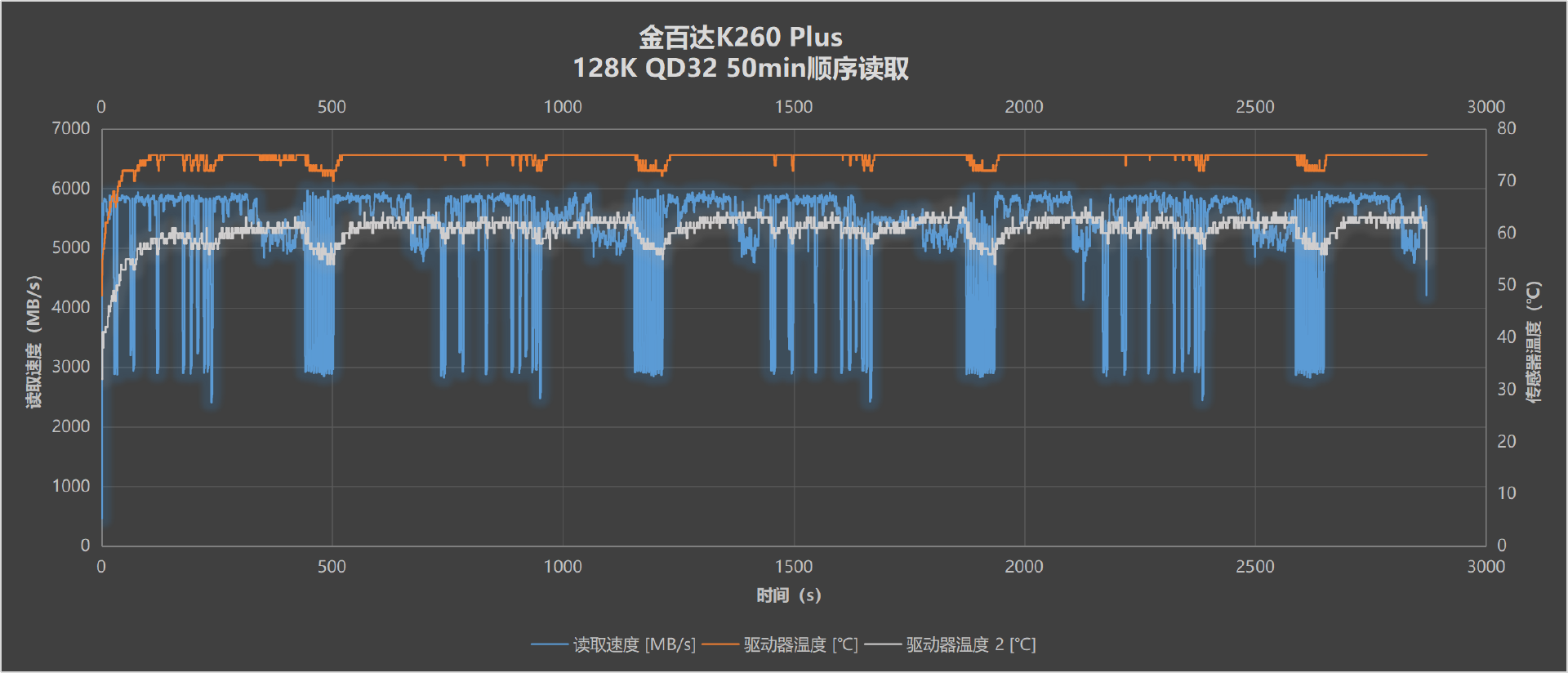 为了探究金百达KP260Plus在长时间高负载下的温度表现,选择对其进行45分钟的128KQD32顺序读取压力测试,并同时记录读取速度与温度表现,生成了以下图表: