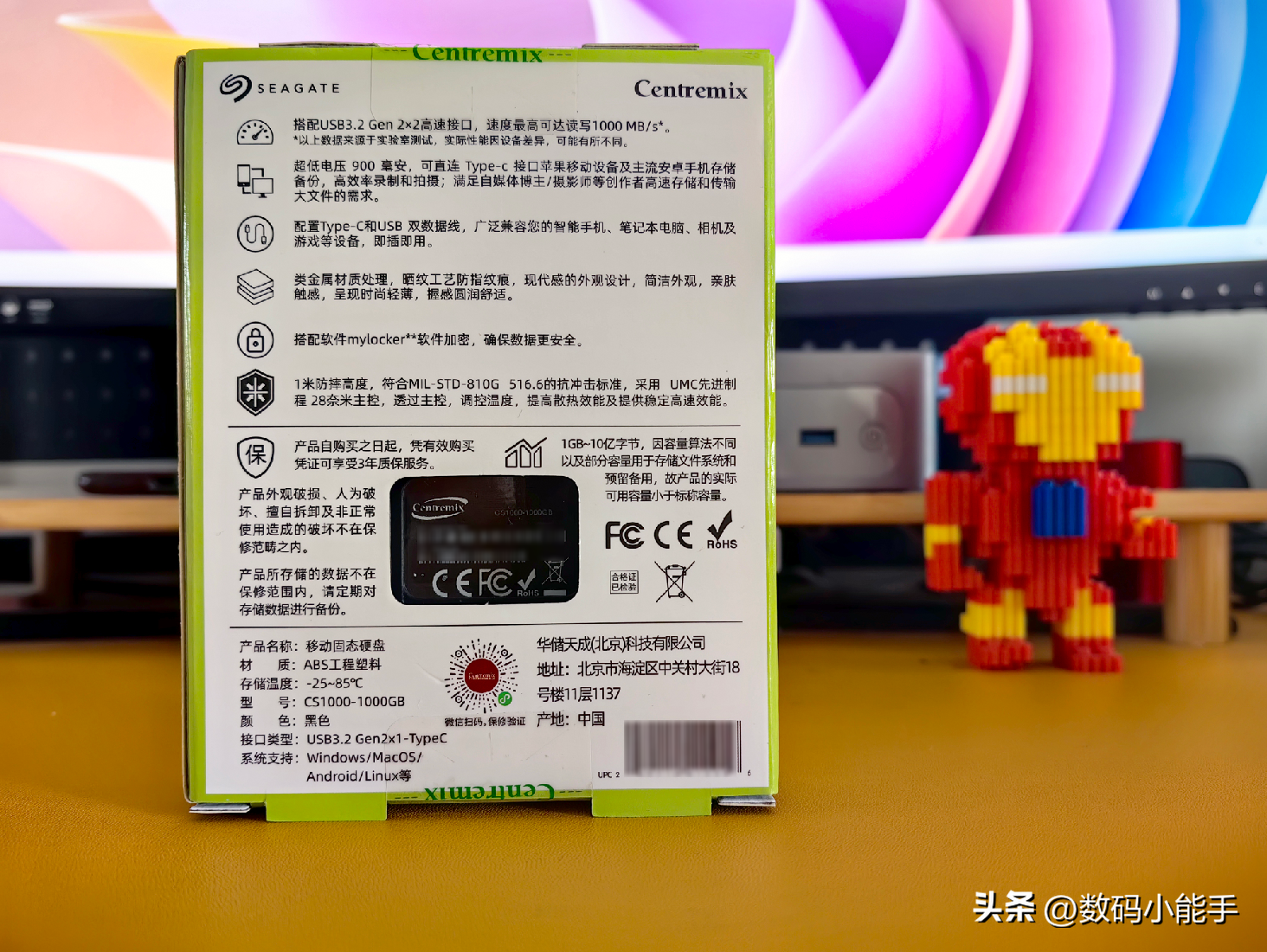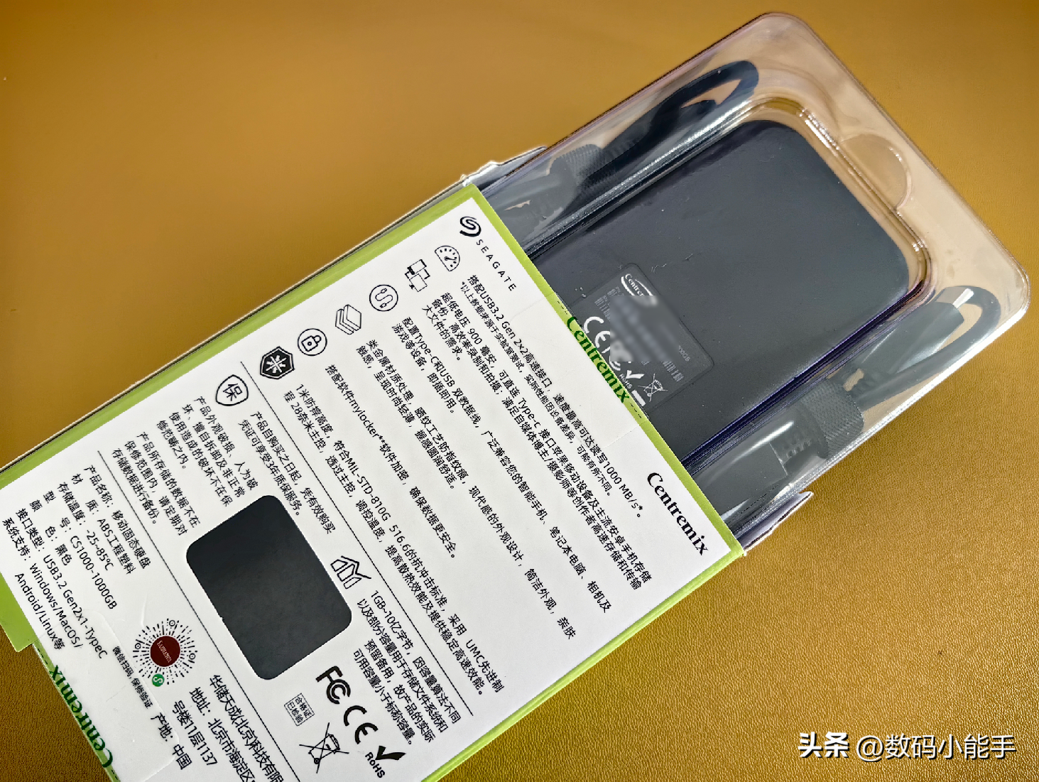 包装方面依旧是希捷一贯的简约设计风格,正面除了产品渲染图,还有希捷与芯点子的联名标识。左上角的1000MB/s展示了它不俗的传输速度,右下角的Win/Mac/Android/Linux说明了它广泛的兼容性,也就说它的使用场景非常多。