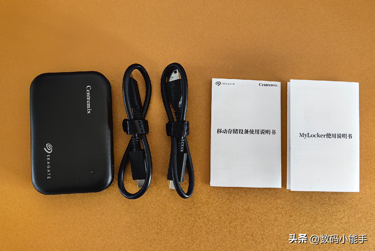 最后看全家福吧!除了芯点子x希捷联名款CS1000高速移动固态硬盘本体外,还有两条数据线(一条AtoC、一条CtoC),一份产品使用说明书,一份MyLocker使用说明书(这个MyLocker可以说是该款产品的特色功能了,咱们稍后再说)。