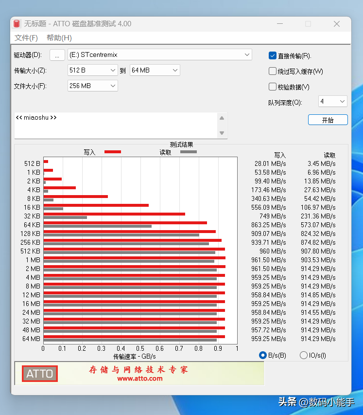 使用ATTO磁盘基准测试软件对它经一步测试,可以帮助我们了解文件大小比例不同对磁盘速度的影响。实测当文件大小达到4KB的时候,写入速度就可以破百,达到128KB的时候,写入和读取基本都能达到900MB/s以上的速度,表现还是不错的。