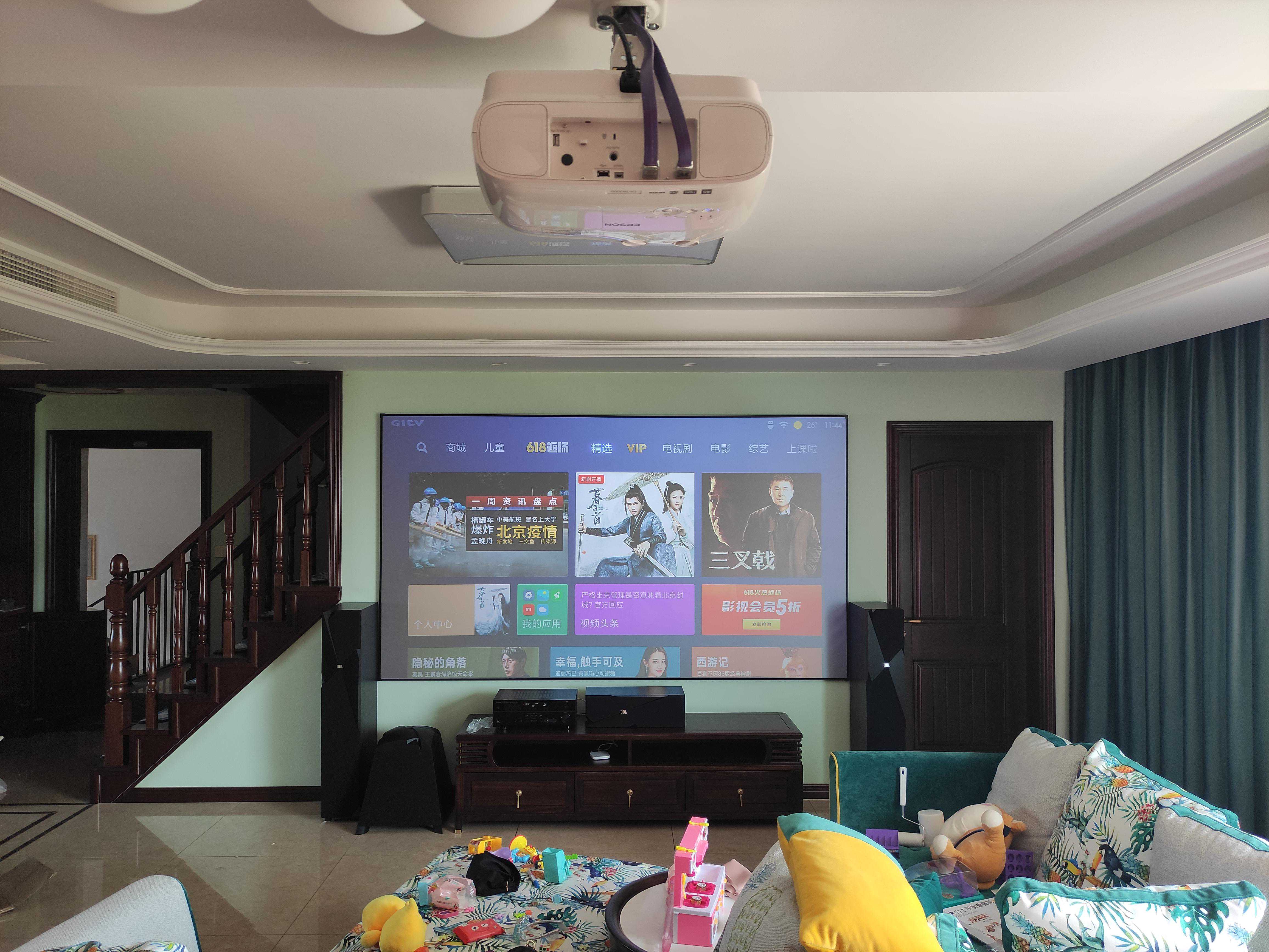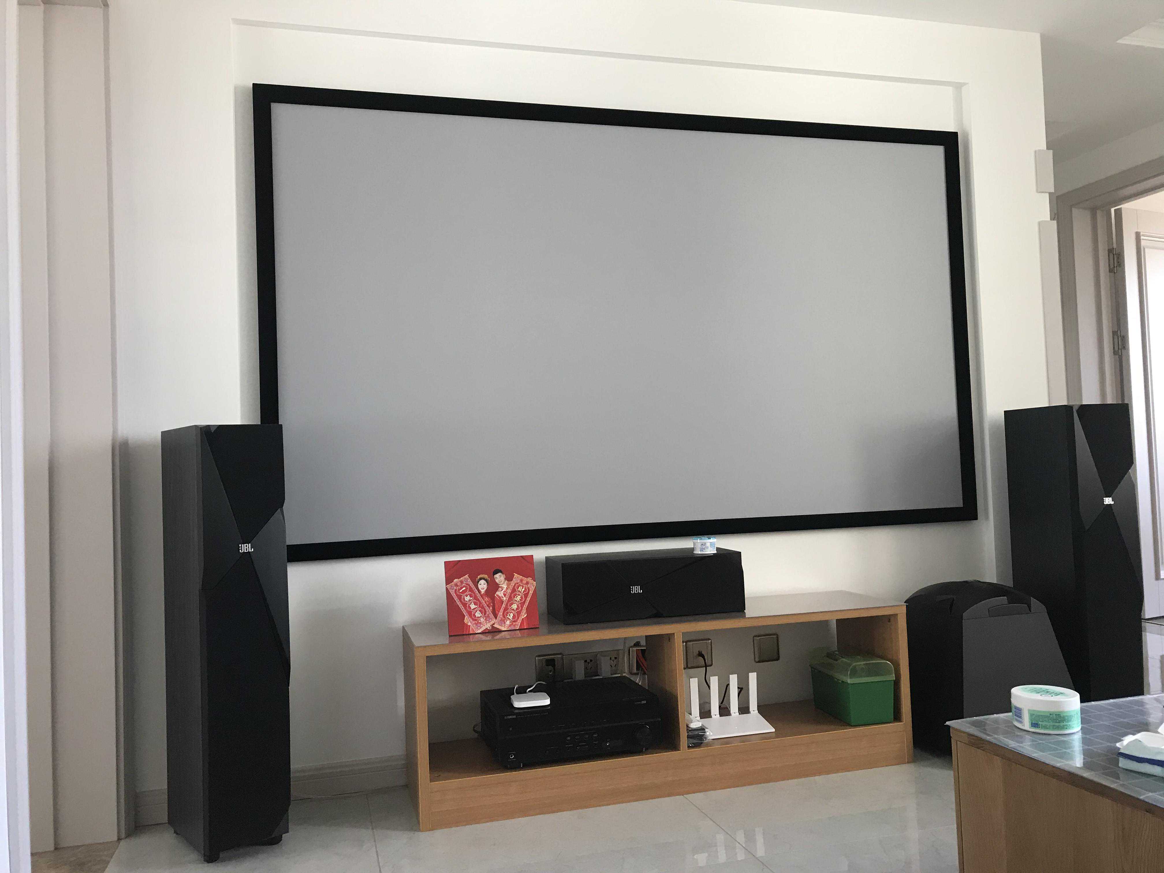 案例一:4年前安装的一套,客户是位70多岁的大姨,没有精力去装修,直接买的别墅样板间,所以贴的明线槽来走线,一楼客厅位置比较宽敞,退休在家喜欢追剧,打造的150寸大屏,客厅位置相对比影音室音响效果虽然差很多,但是使用比较方便,使用率也比较高一些。客户最满意的是屏幕大,字也大,看着不累眼,投影的漫反射原理也不伤眼。