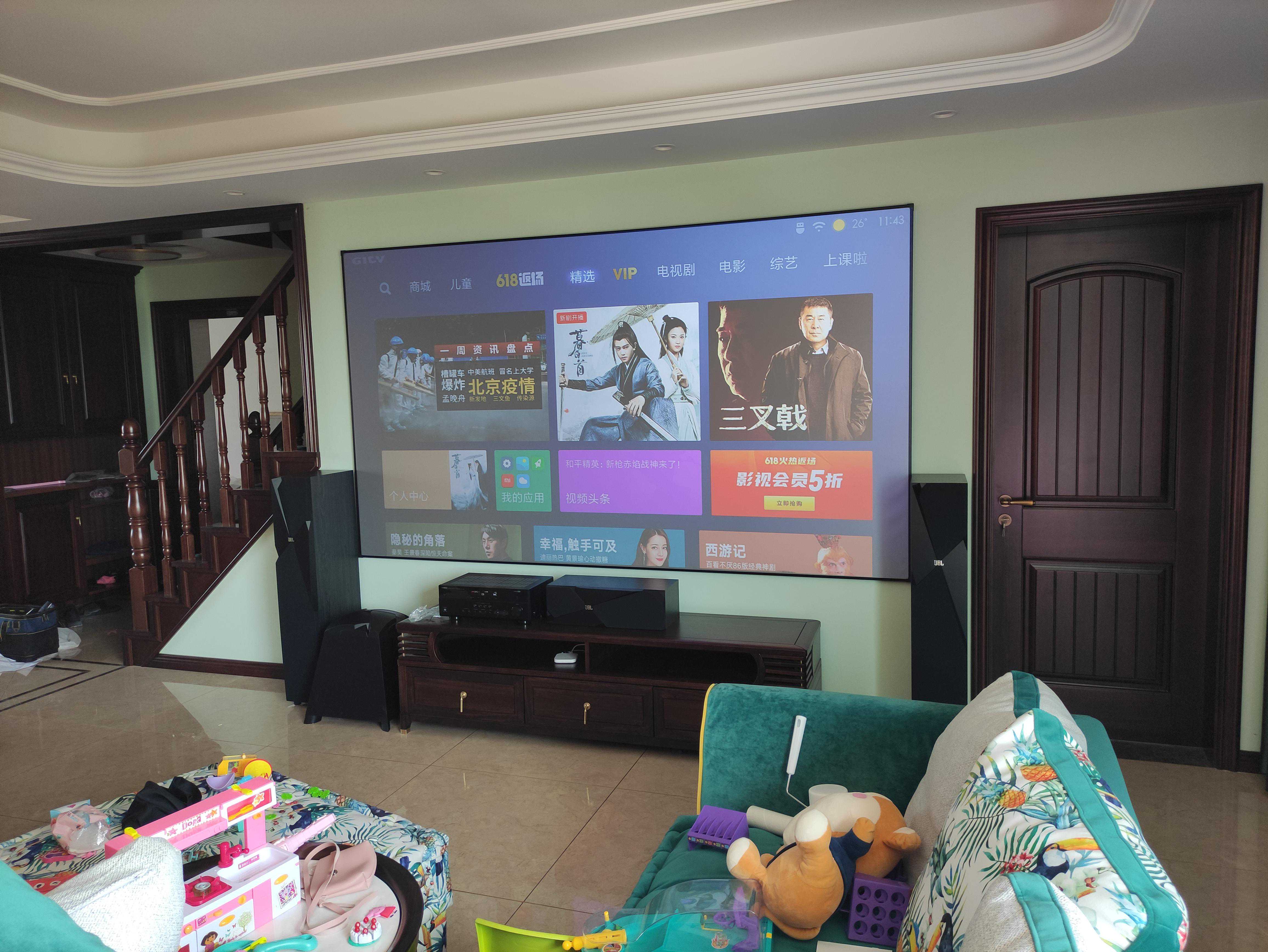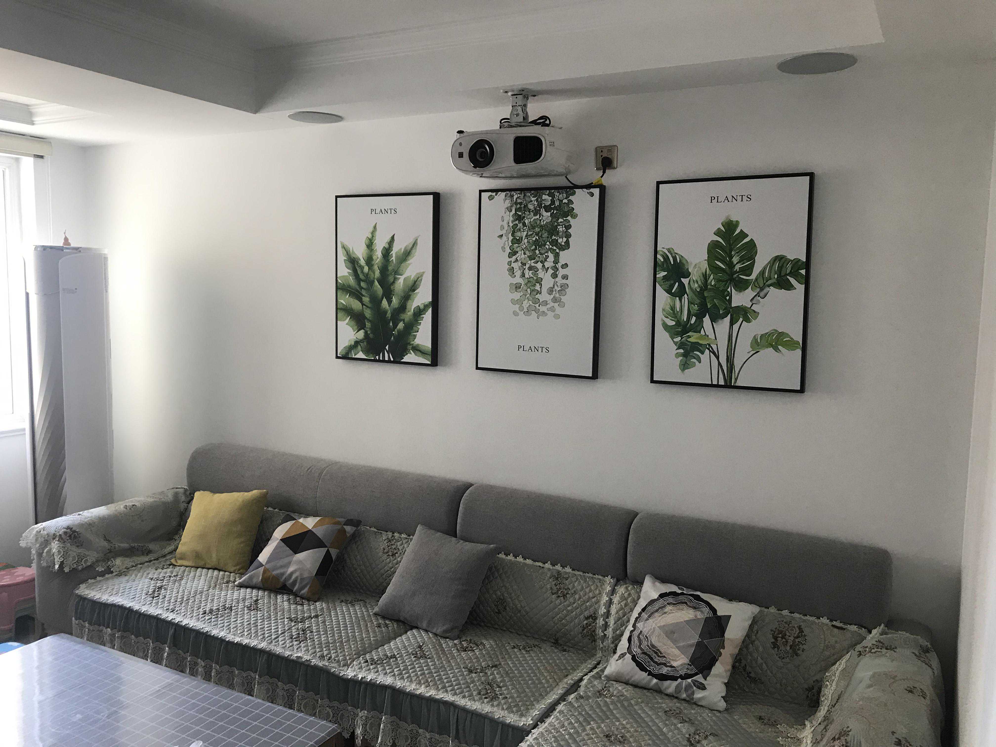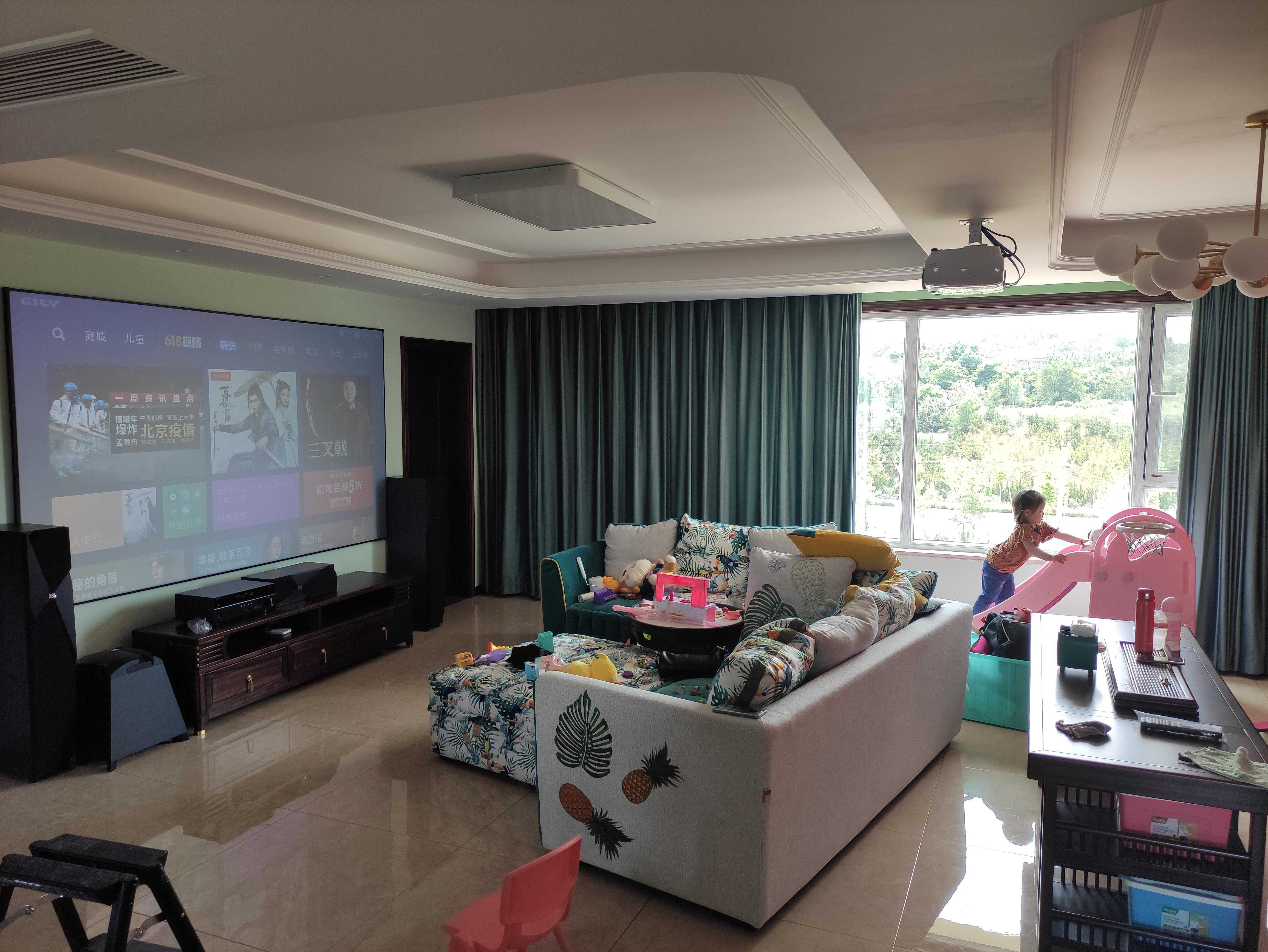 案例六:同一小区两户组团一起到店定的,客厅空间比较大,沙发后还能放茶桌,120寸屏幕在这也不显得大,客厅是一家人聚集活动的地方,也是孩子的乐园。不看电影的时候,听个音乐喝喝茶也是不错的享受。