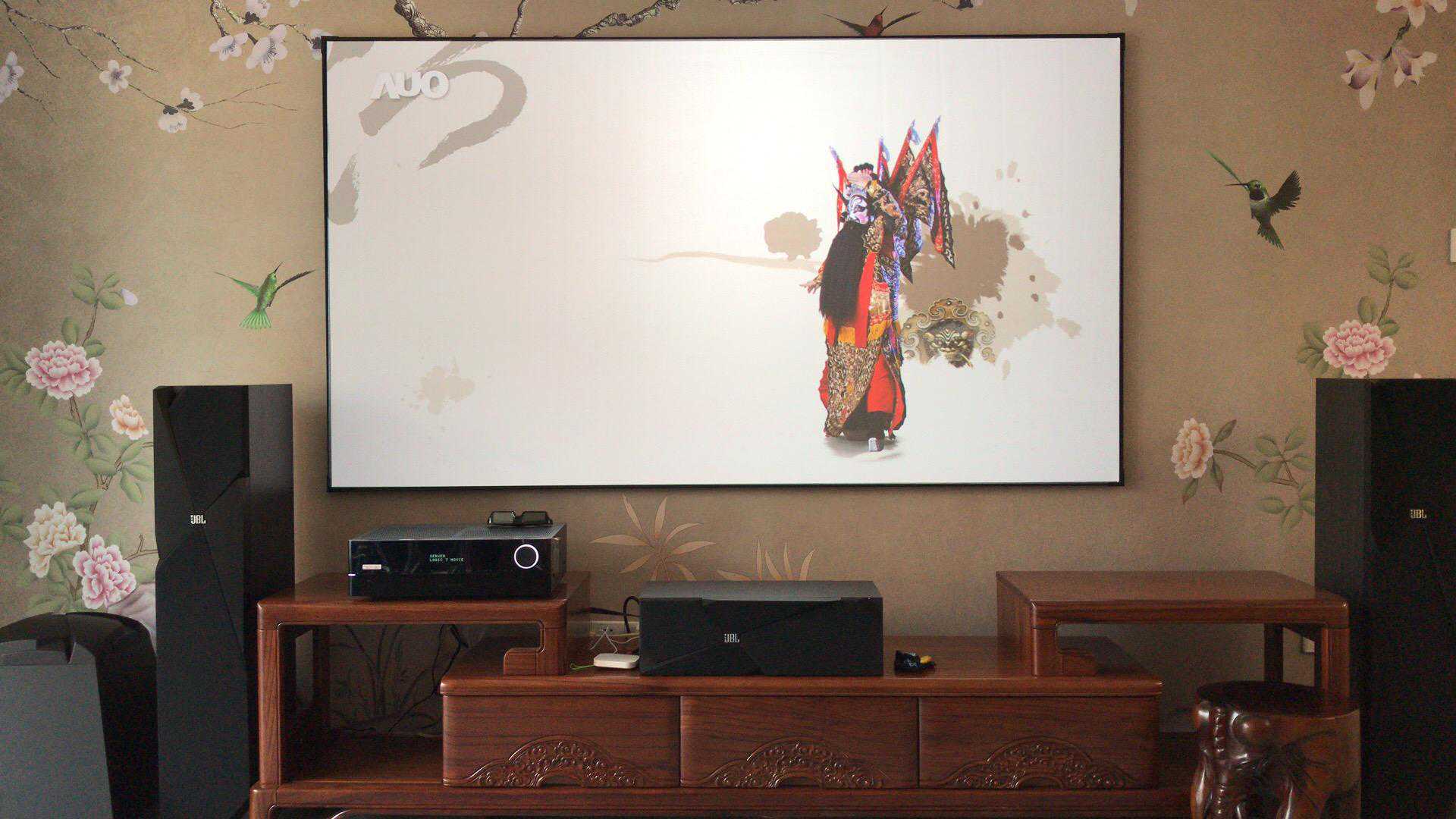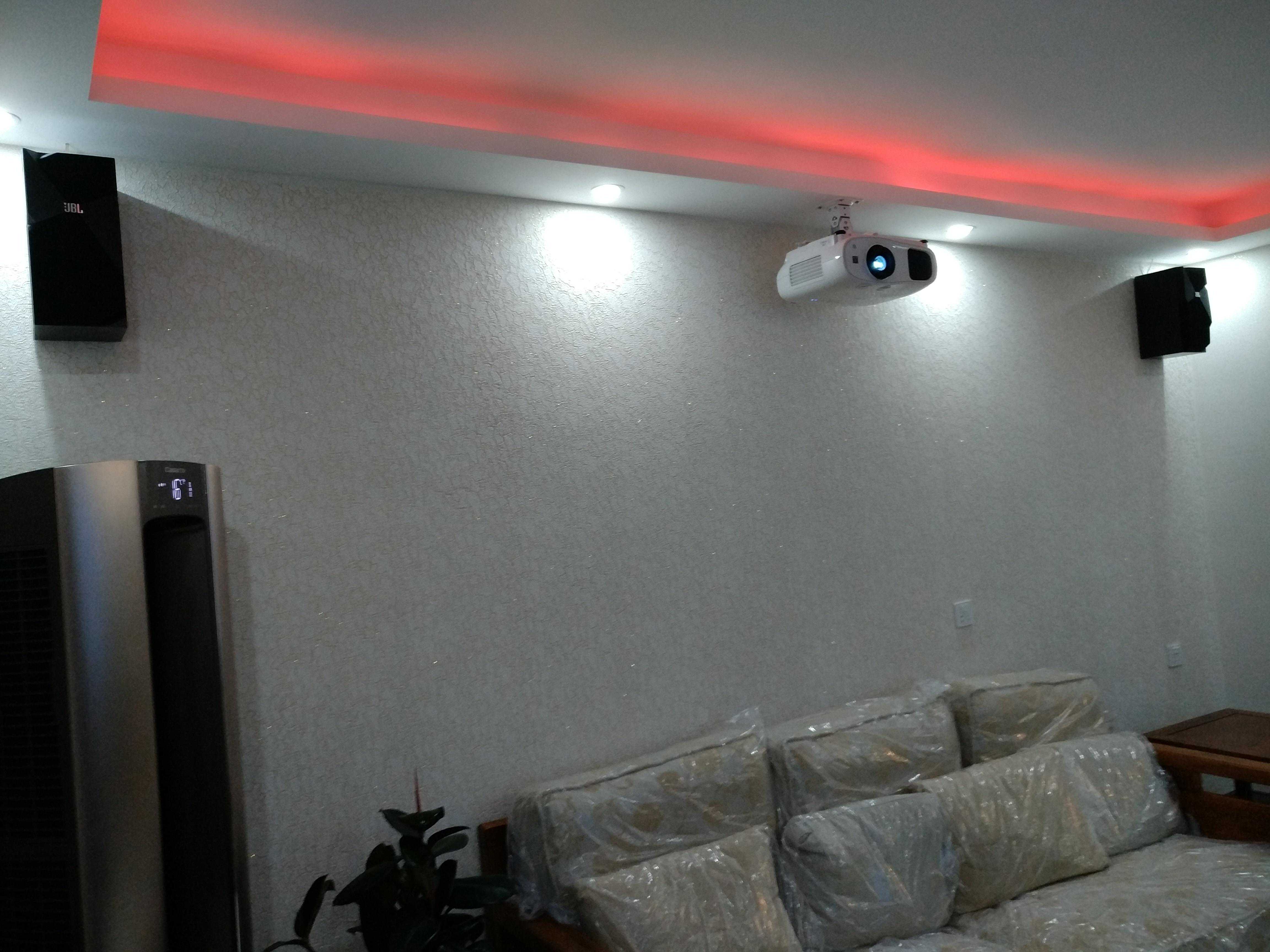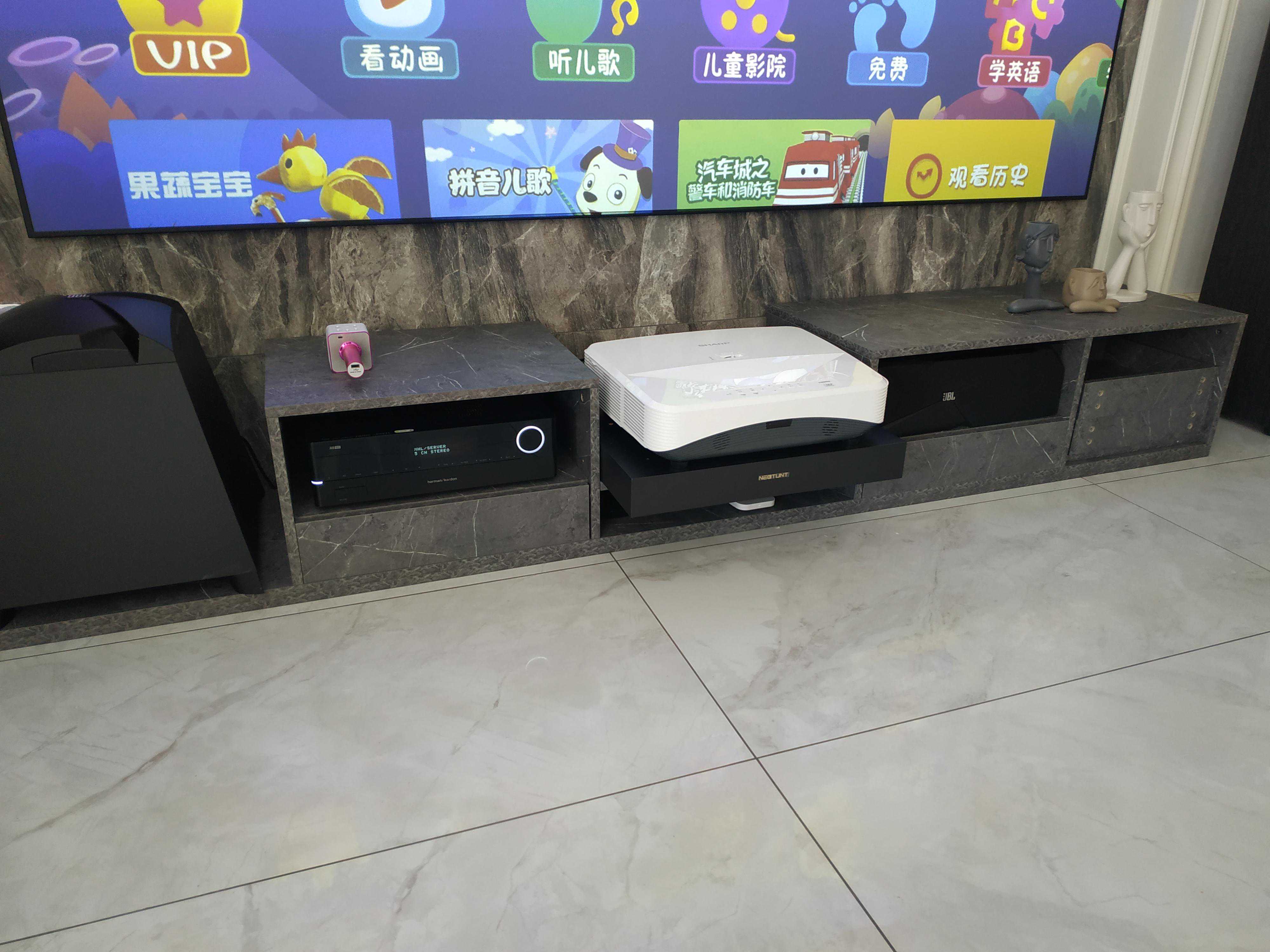 案例八:夏普激光电视+家庭影院,定制的110寸硬屏,电视柜也是设计好定制的,隐藏功放和中置音箱。加了舜合的伸缩台,解决了激光电视投射比不能靠墙的问题。装修整体感觉要求比较高,沙发墙有造型,所以后环绕也采用的JBL吸顶音响来隐藏。