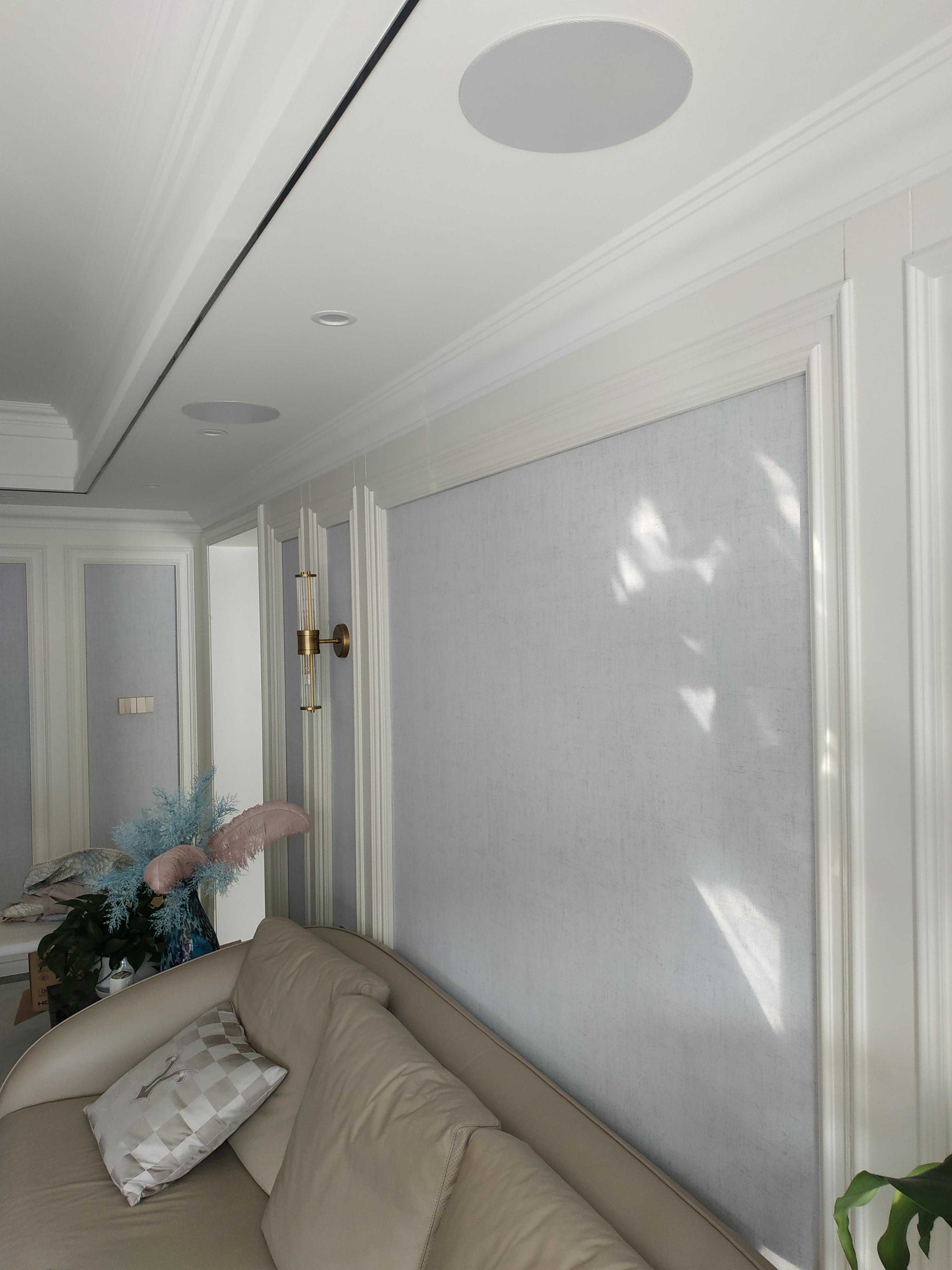 案例二:这是一个朋友家,去过我展厅几次就对这套音响种草了,小户型开始我推荐的卫星音箱,结果还是他执意要上这套,即使前置音响有点碍事也能接受。空间确实太小,后环绕无处安放,更改设计为JBL吸顶音箱。天空喇叭听音乐效果更佳。
