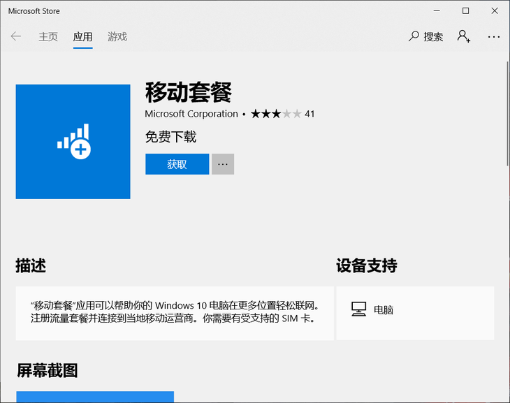 使用4G功能需要在WiFi下从微软商店下载“移动套餐”APP。