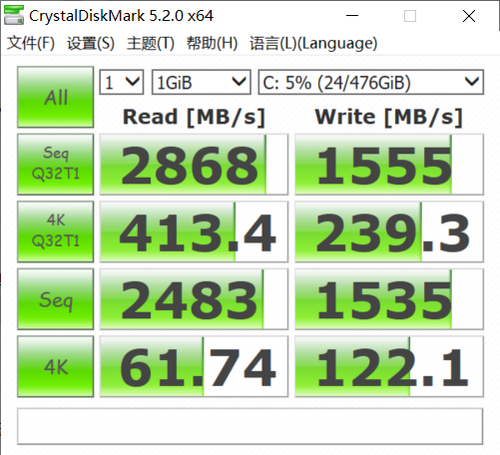 在CrystalDiskMark中,持续读取性能达到了2868MB/s,持续写入1555MB/s。4K性能表现同样达到了相当高的水准。整体上达到了目前主流NVMe硬盘的高端水平。