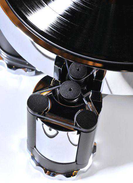 我们熟悉的LINN是通过底座内置三点弹簧悬浮的方式构成软避震结构的,其中遇到最大的问题是调校起来比较麻烦,需要专用的支架支撑后才能调校。而推出年代较新的AVID则设计了两层底座,底层三瓣式底座采用精密铸造方式制造,外沿设计了粗壮的悬浮脚座,对整体唱盘作前二后一的三点式支撑。精妙之处在于三个脚座内颇为复杂的结构,首先是每个脚座各内置一个螺旋弹簧作垂直方向的避震,其次再通过惰性胶圈作水平方向的限位固定,从而令转盘轴承底座悬浮于支脚底座上,彻底隔离了从机架等环节传导的震动干扰。