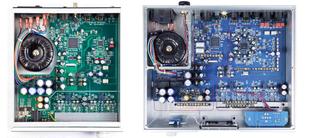 从官方给出的电路图上也可以看出:DA1(右侧)相较于出DA11(左侧),也仅仅是为了追求更高的DAC指标,在其周边电路上堆了更多的电容与电阻。同时晶体管的极限性能比DA1也要比DA11强一些。此外,在电路板的整体布局,走线以及用料方面,二者并无明显差距。DA11在保留了旗舰机DA1核心功能与绝大部分性能的情况下,利用成开发前作积累下来的成熟经验,有效地控制住了成本,并做到了更加亲民的价格。为如何开发设计次旗舰音响产品,立下了一道标杆。