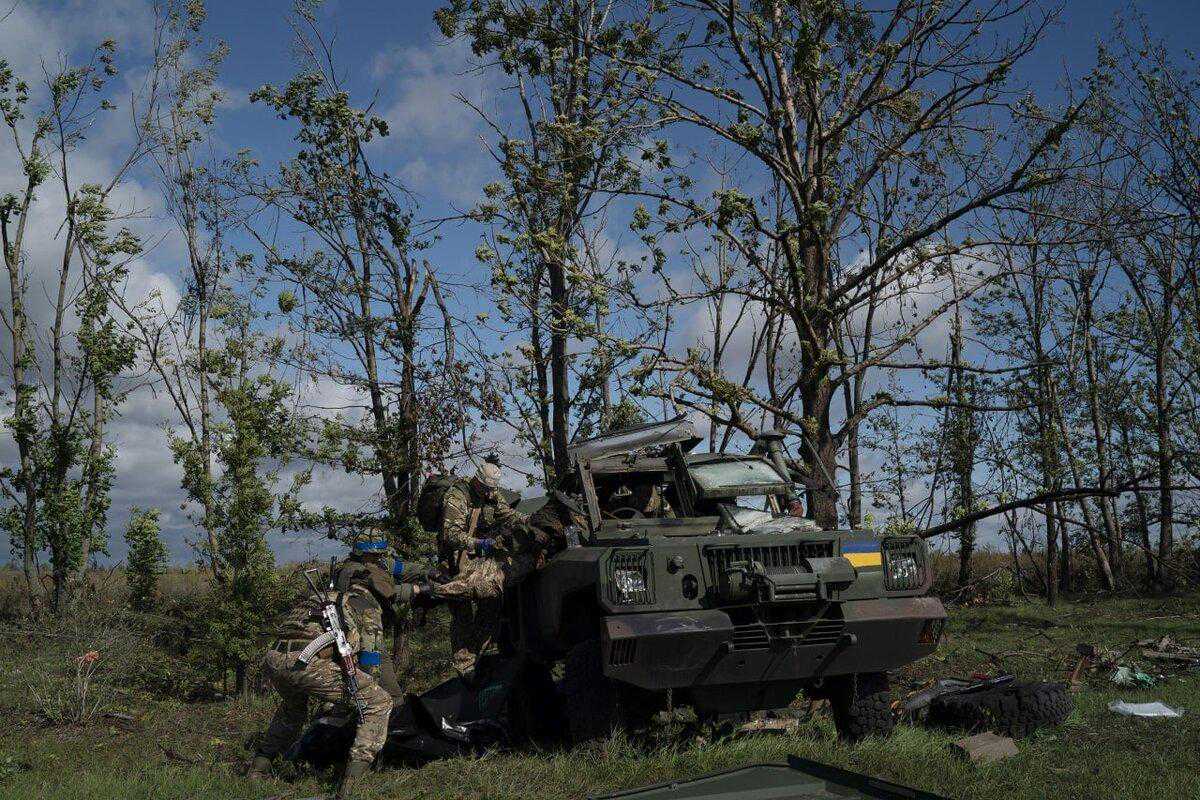 在哈尔科夫地区,乌克兰士兵从一辆受损的爱沙尼亚装甲车MambaMk2EE中拉出同事的尸体。